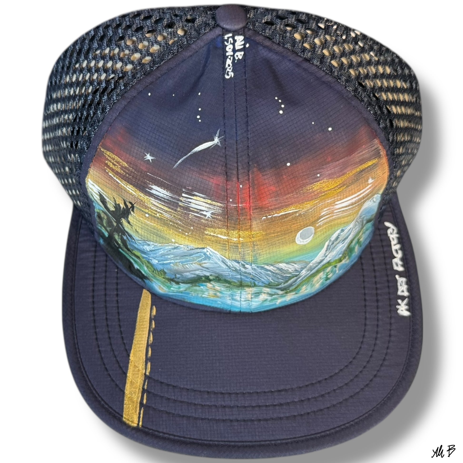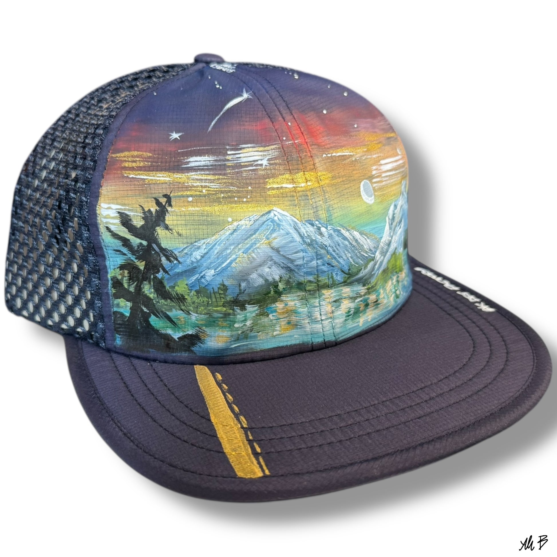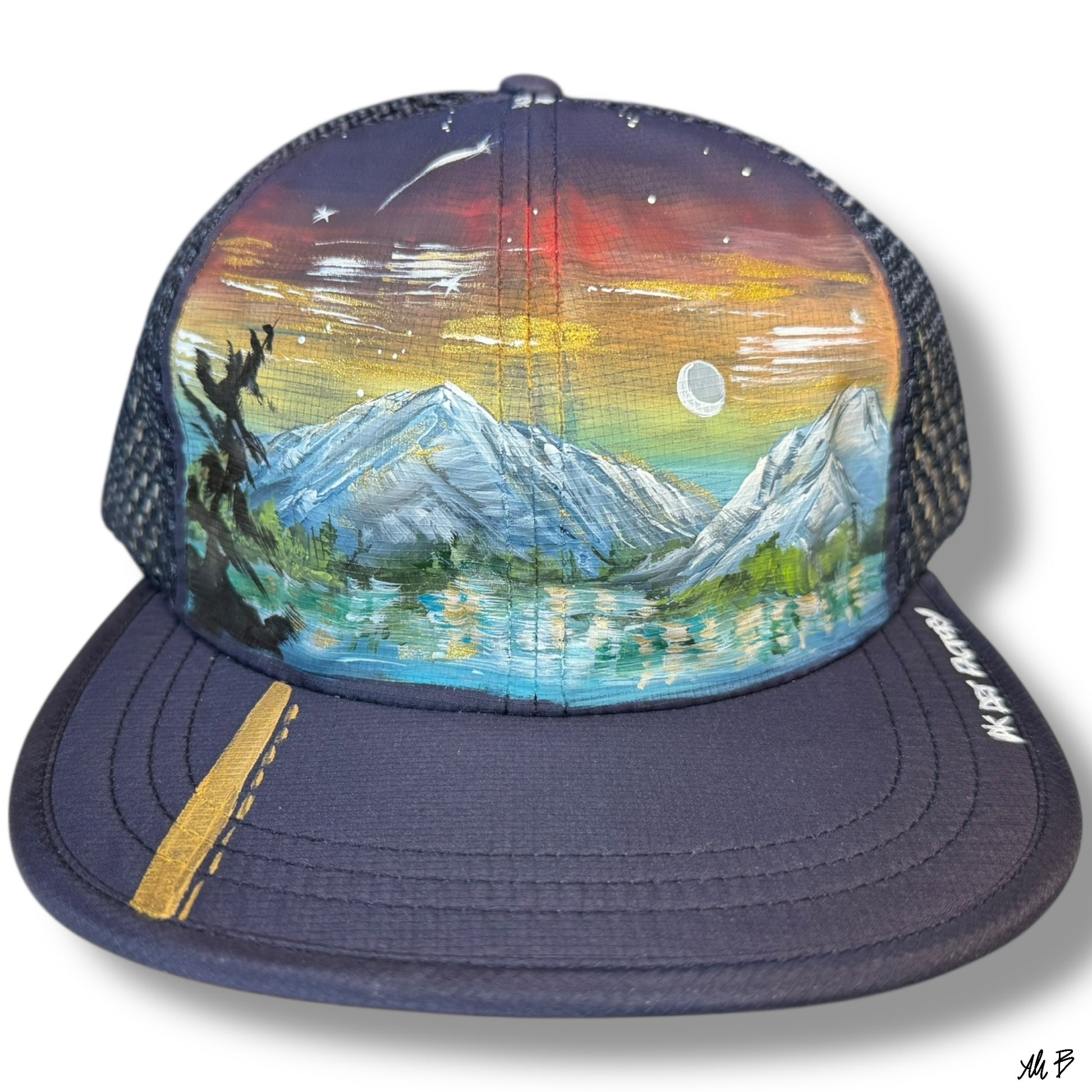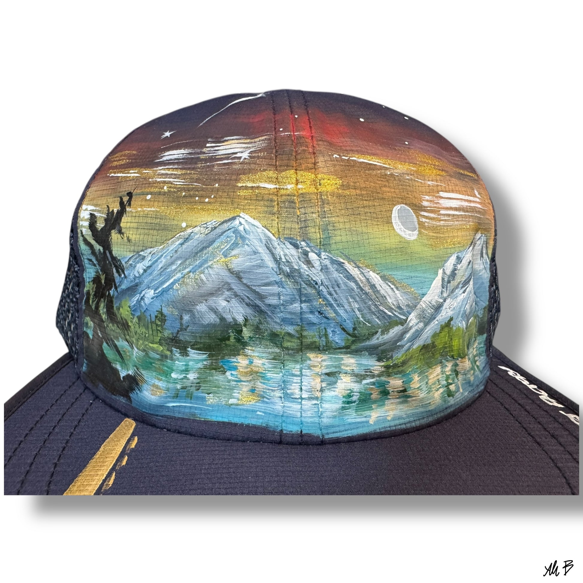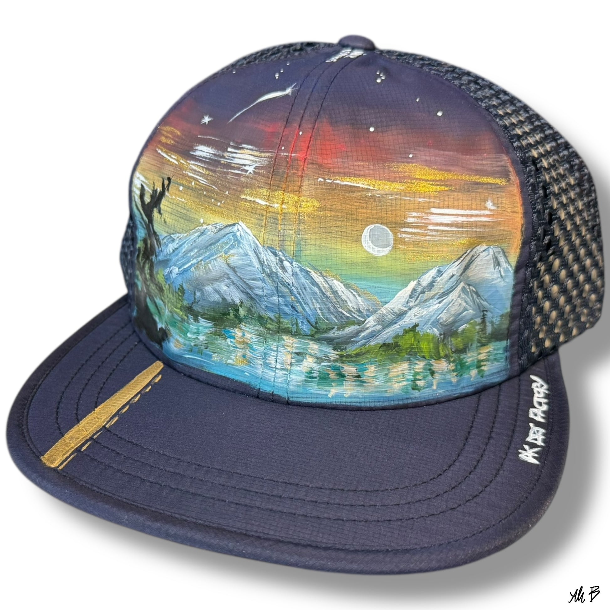 The moon is up, but the sky twinkles with metallic gold paint, leaving reflections in the water. There is a gold stripe painted onto the bill of the hat, adding a little extra fun to this Crumple Cap!