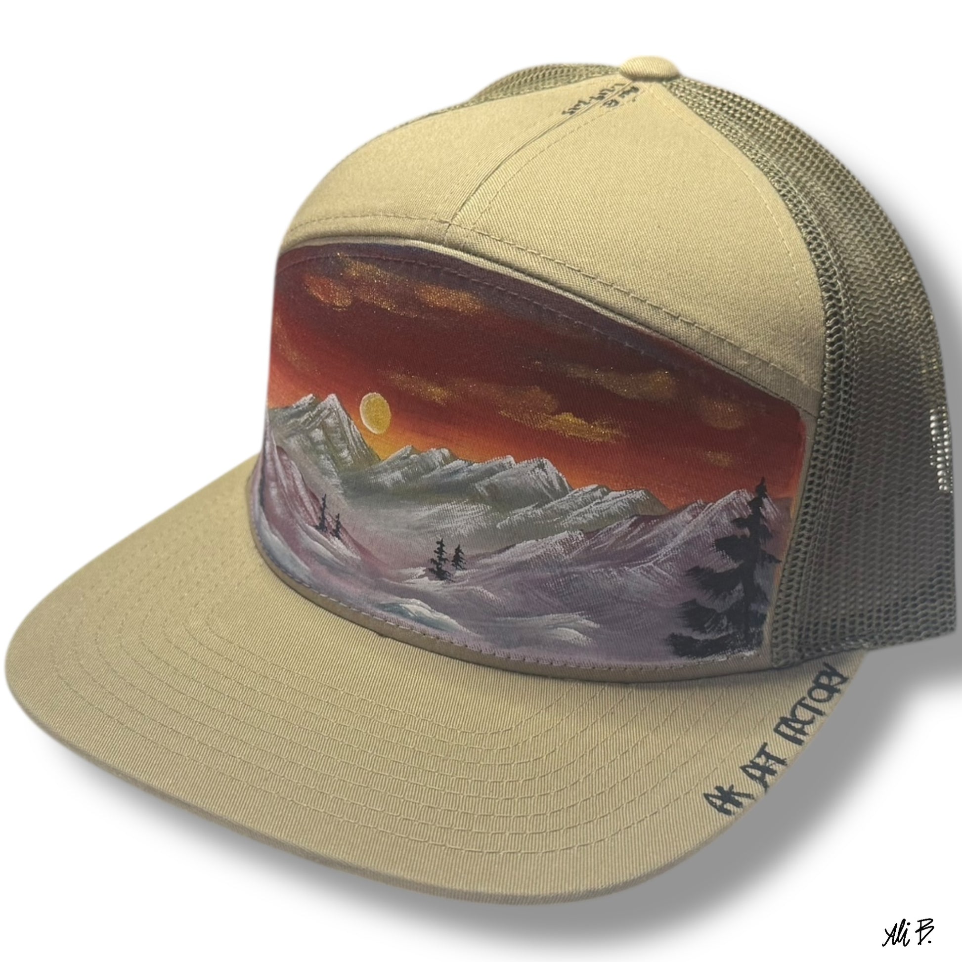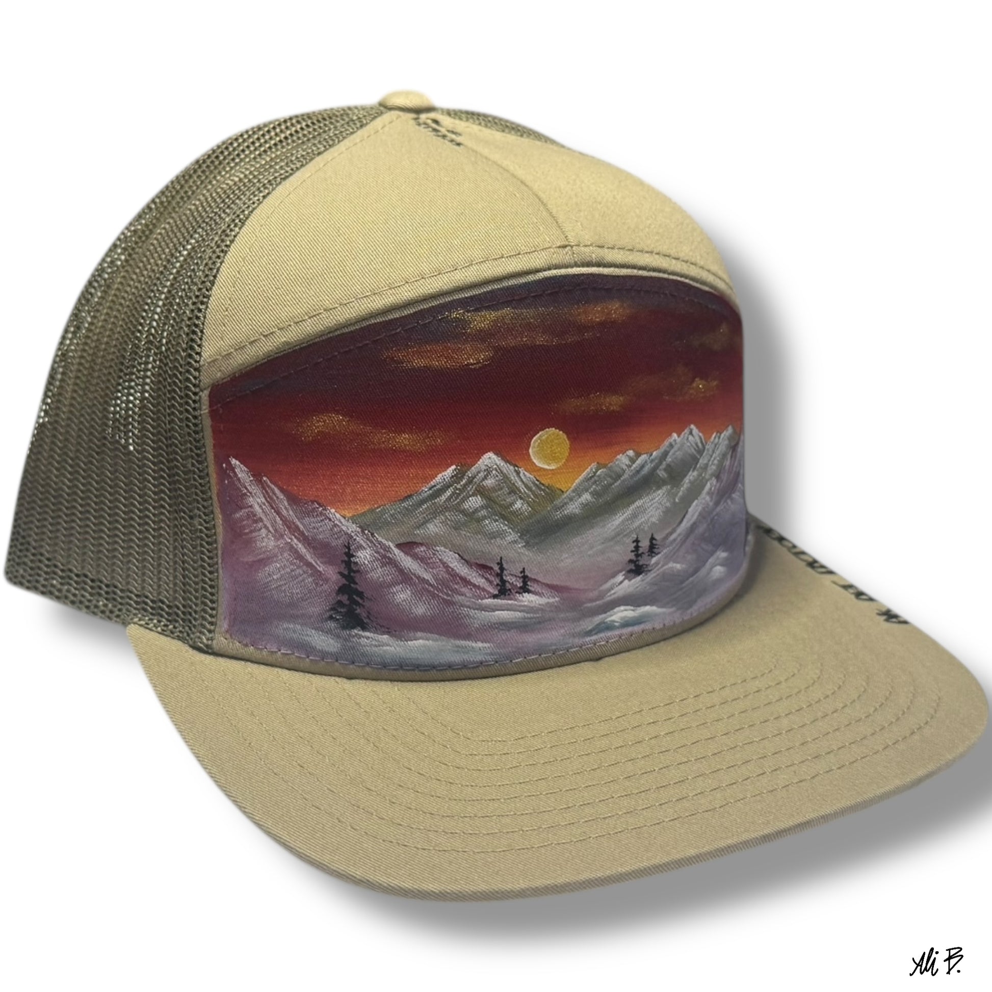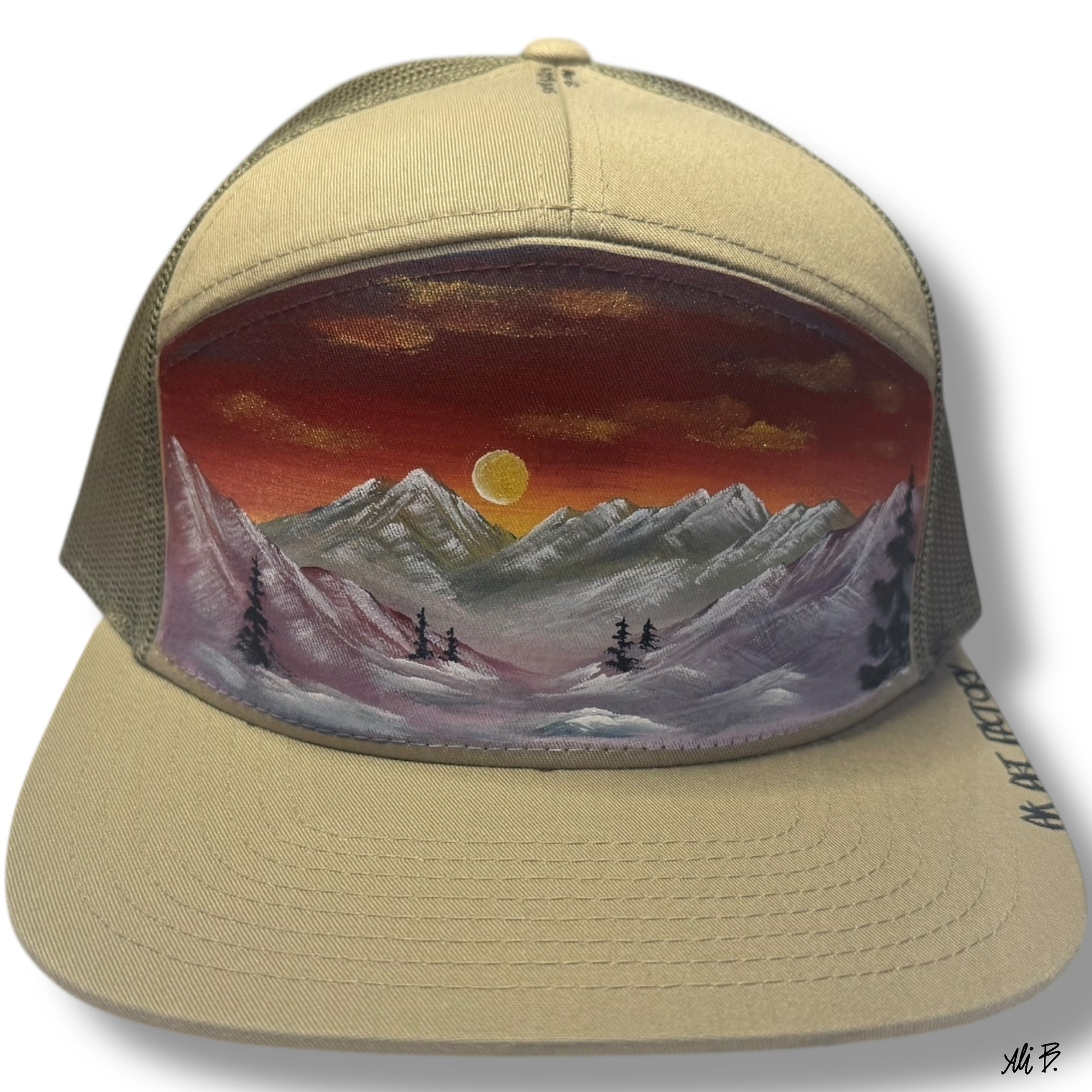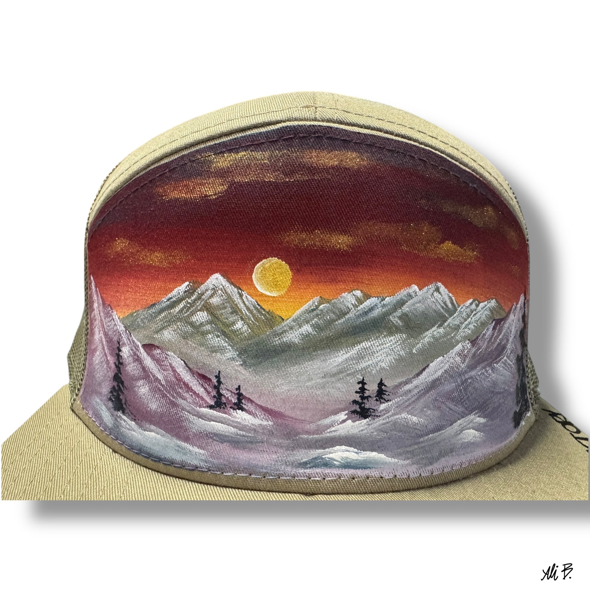 This hand painted hat takes you away to a snowy meadow with metallic gold clouds and trees scatted about.