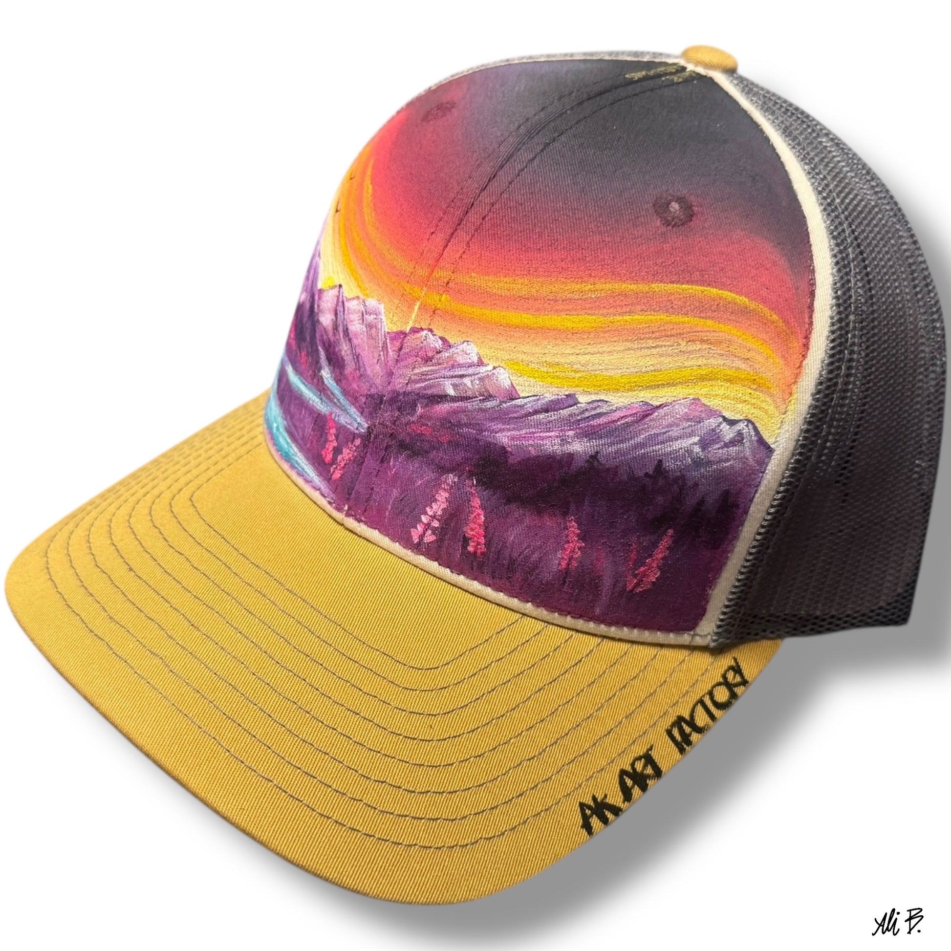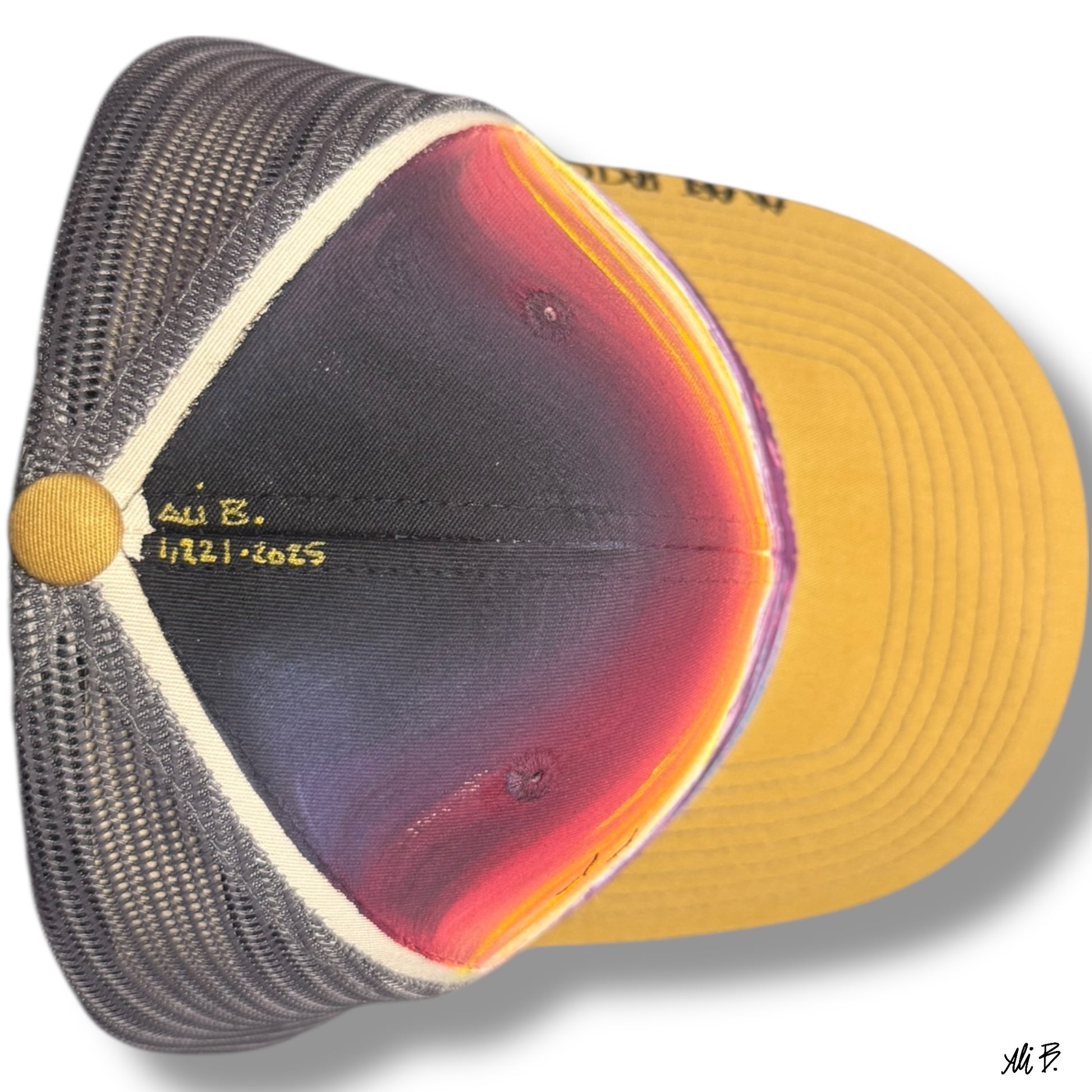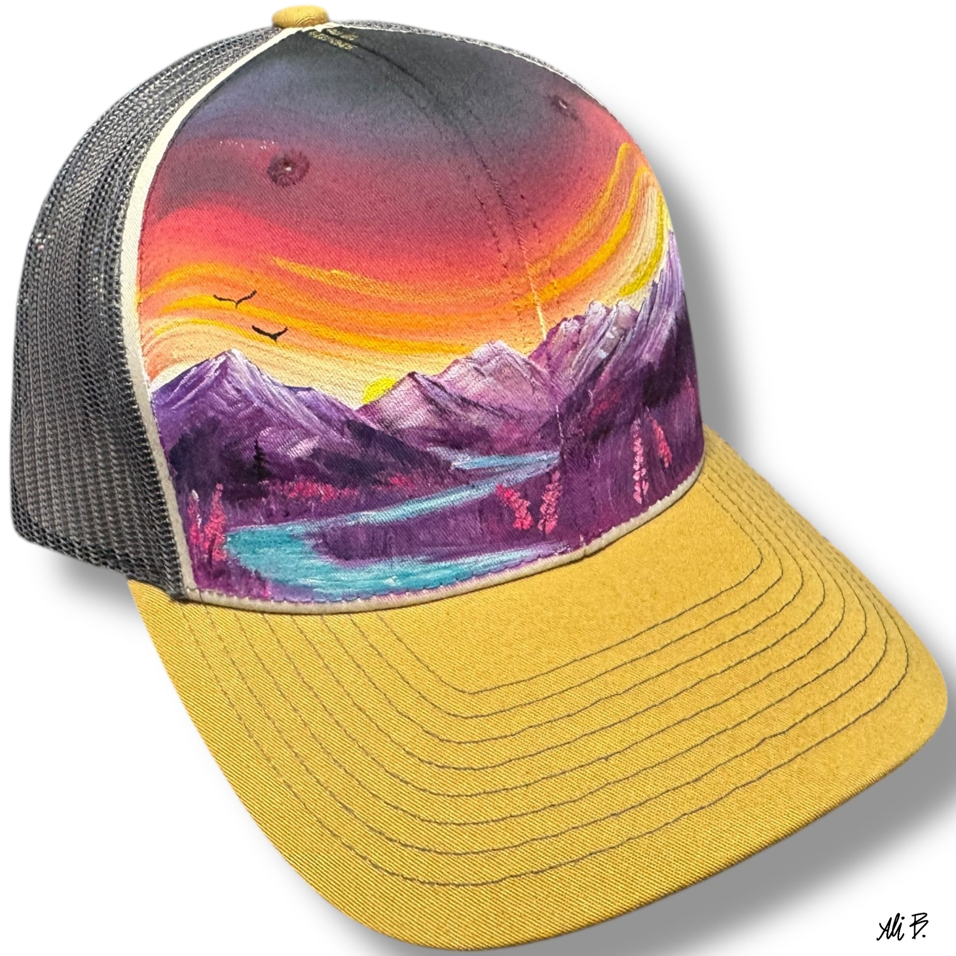 - Color: grey mesh backing, mustard yellow bill with grey stitching
