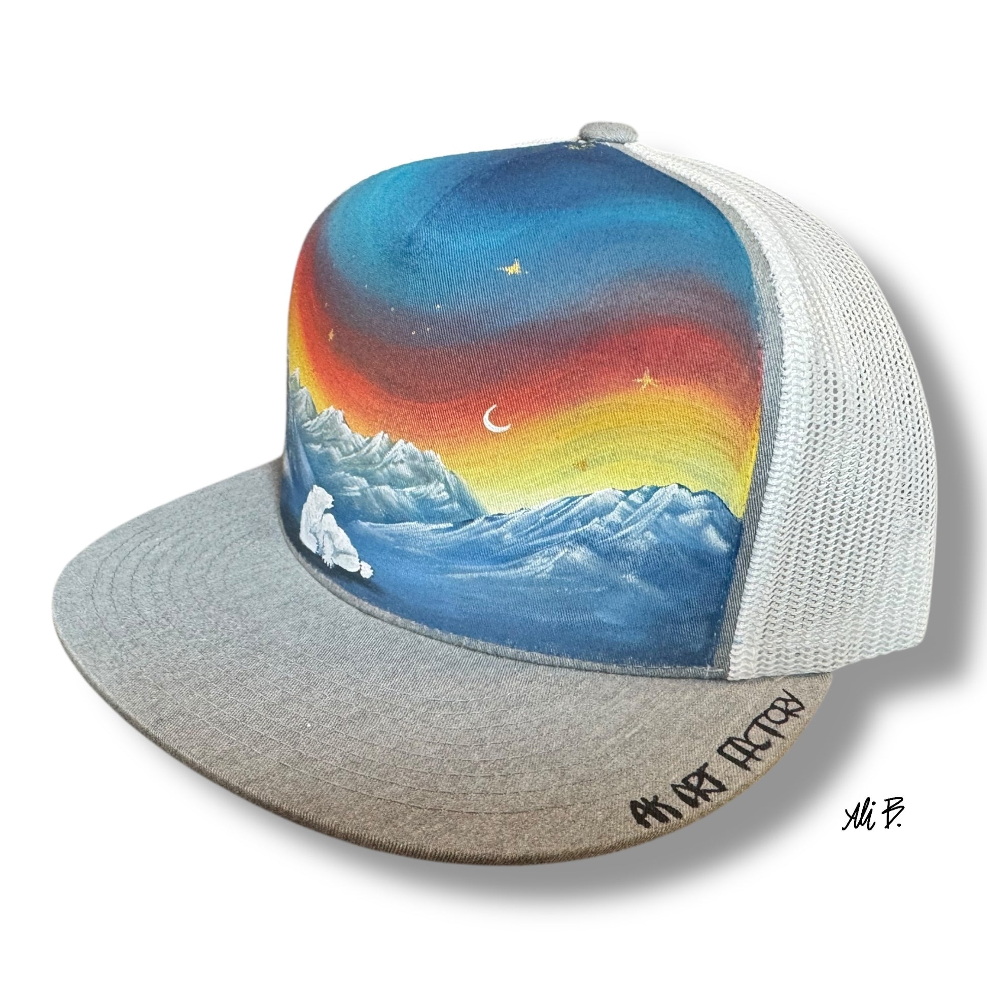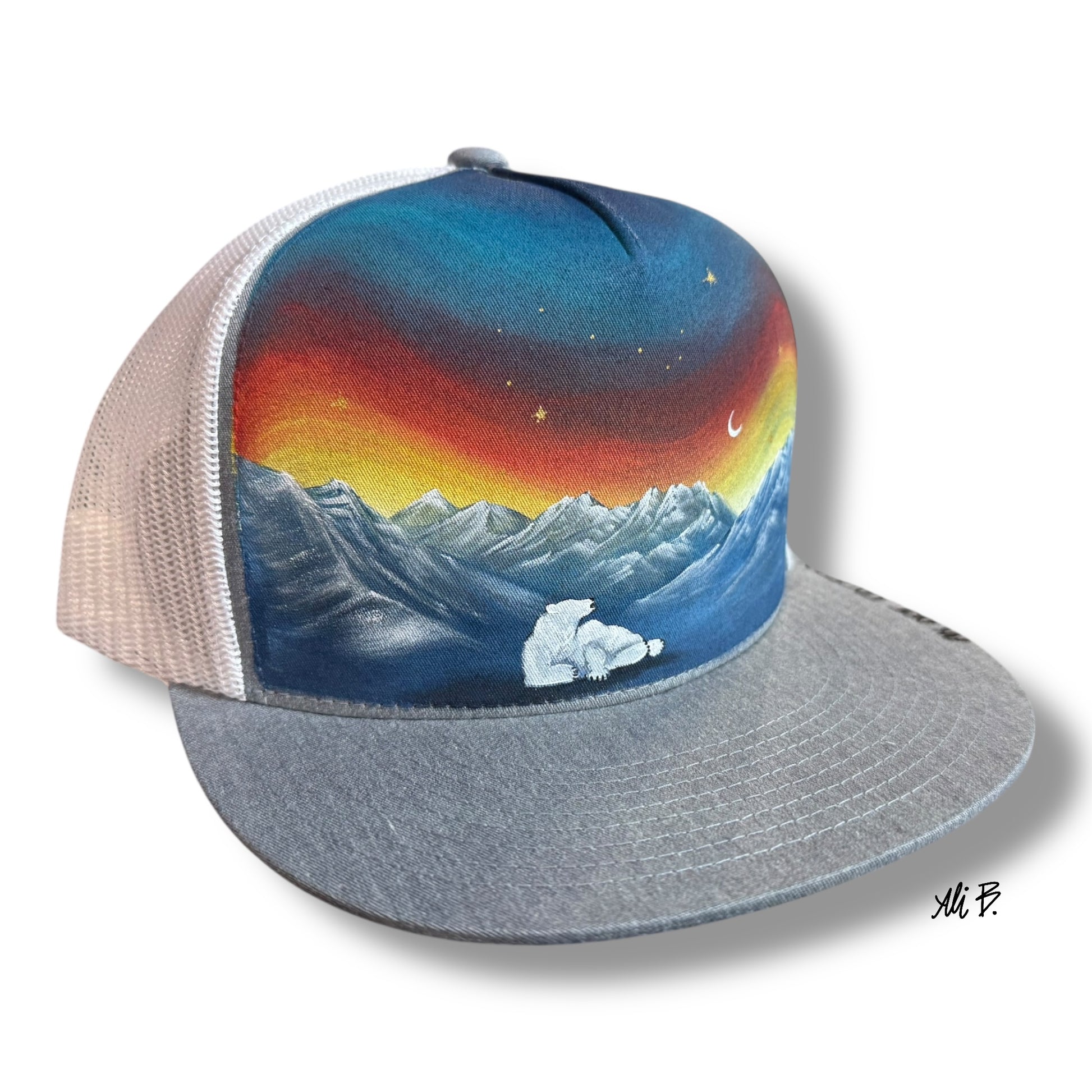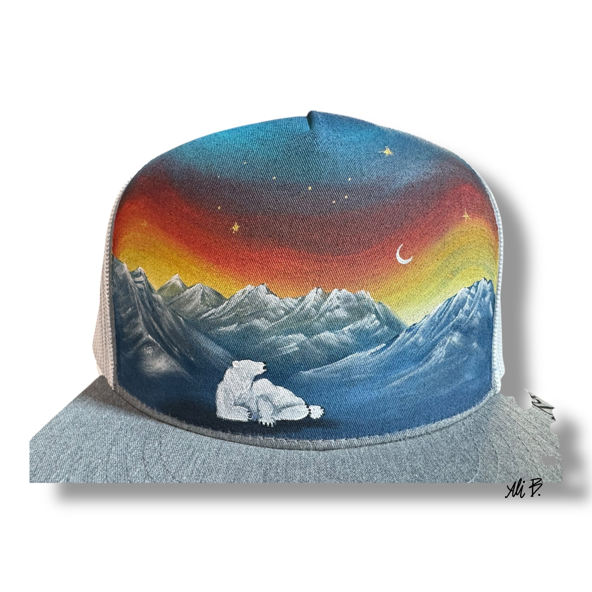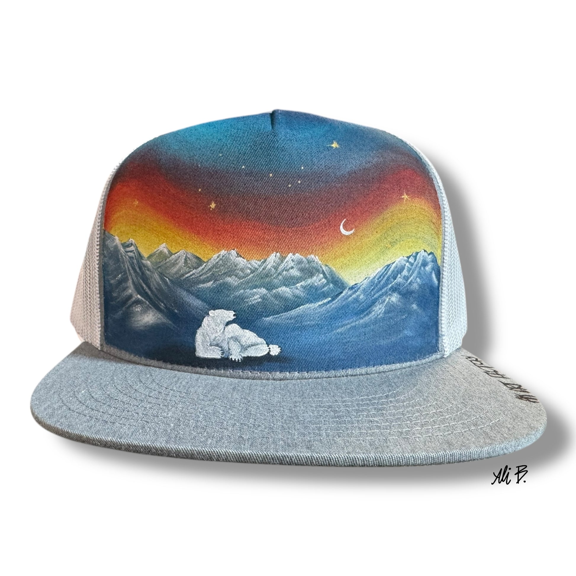 This polar bear lays under the Big Dipper in a blue tinted meadow below the snowy mountains, gazing up at the moon, basking in its presence.