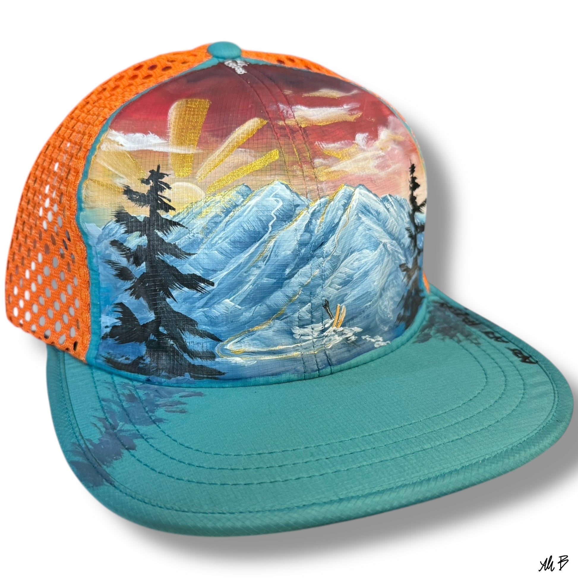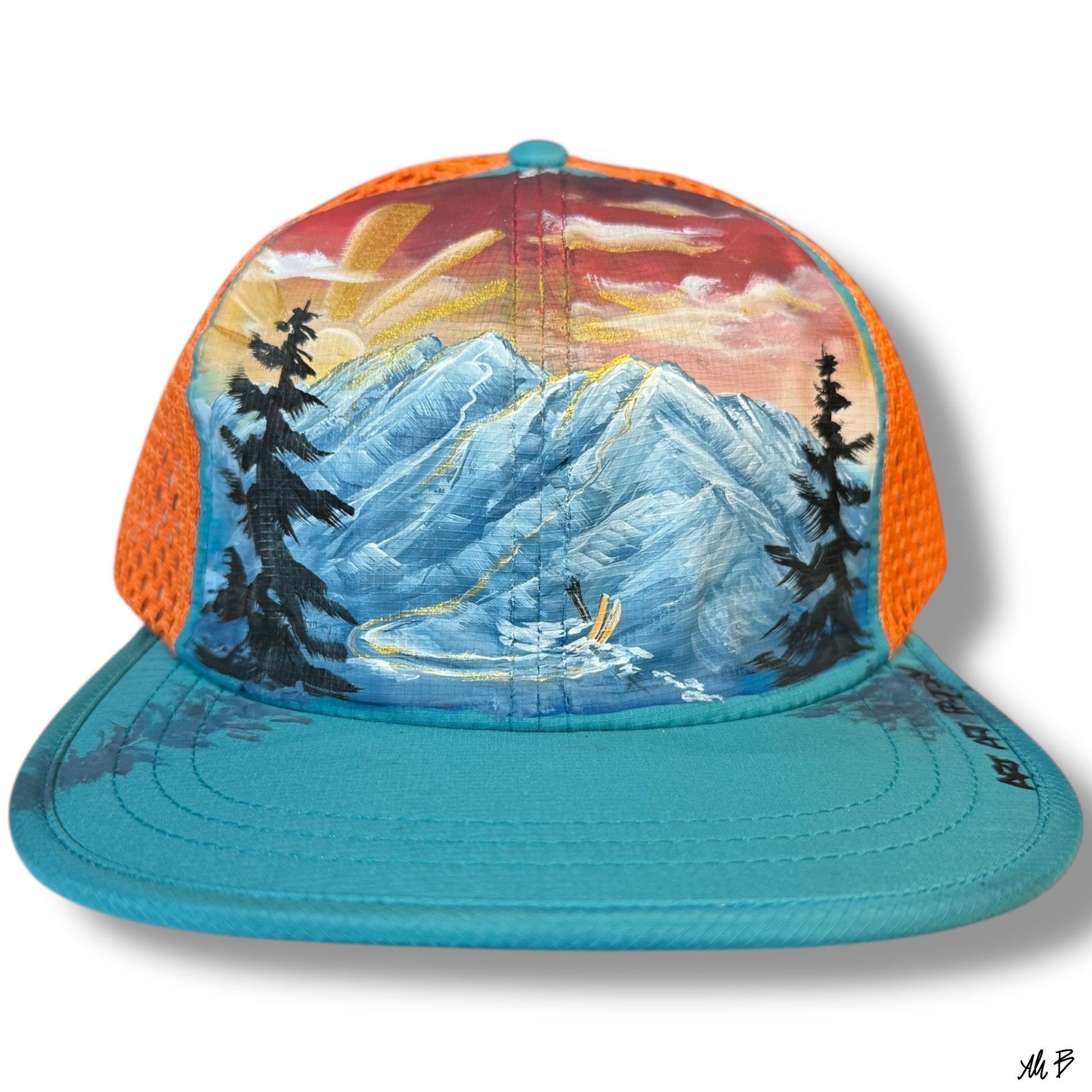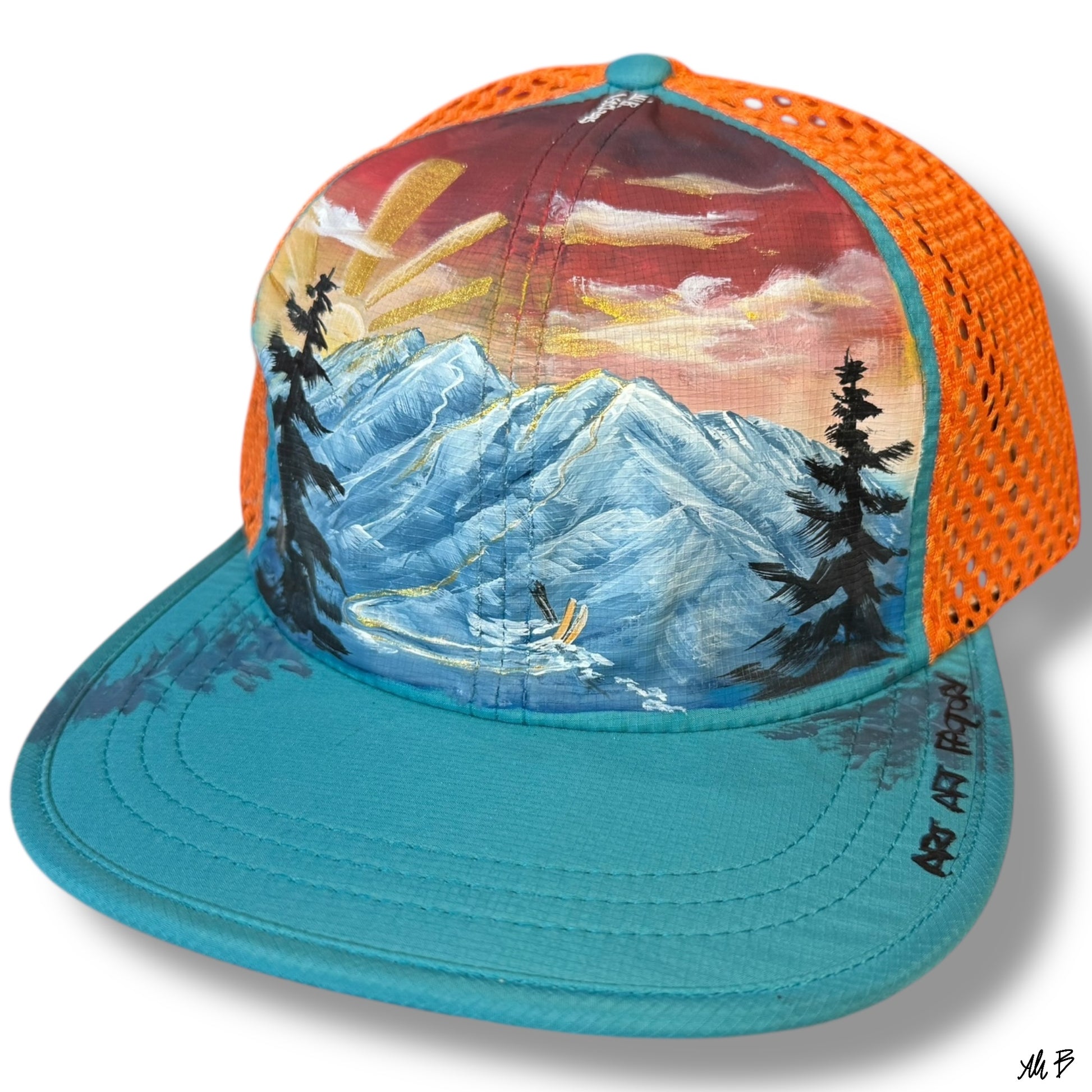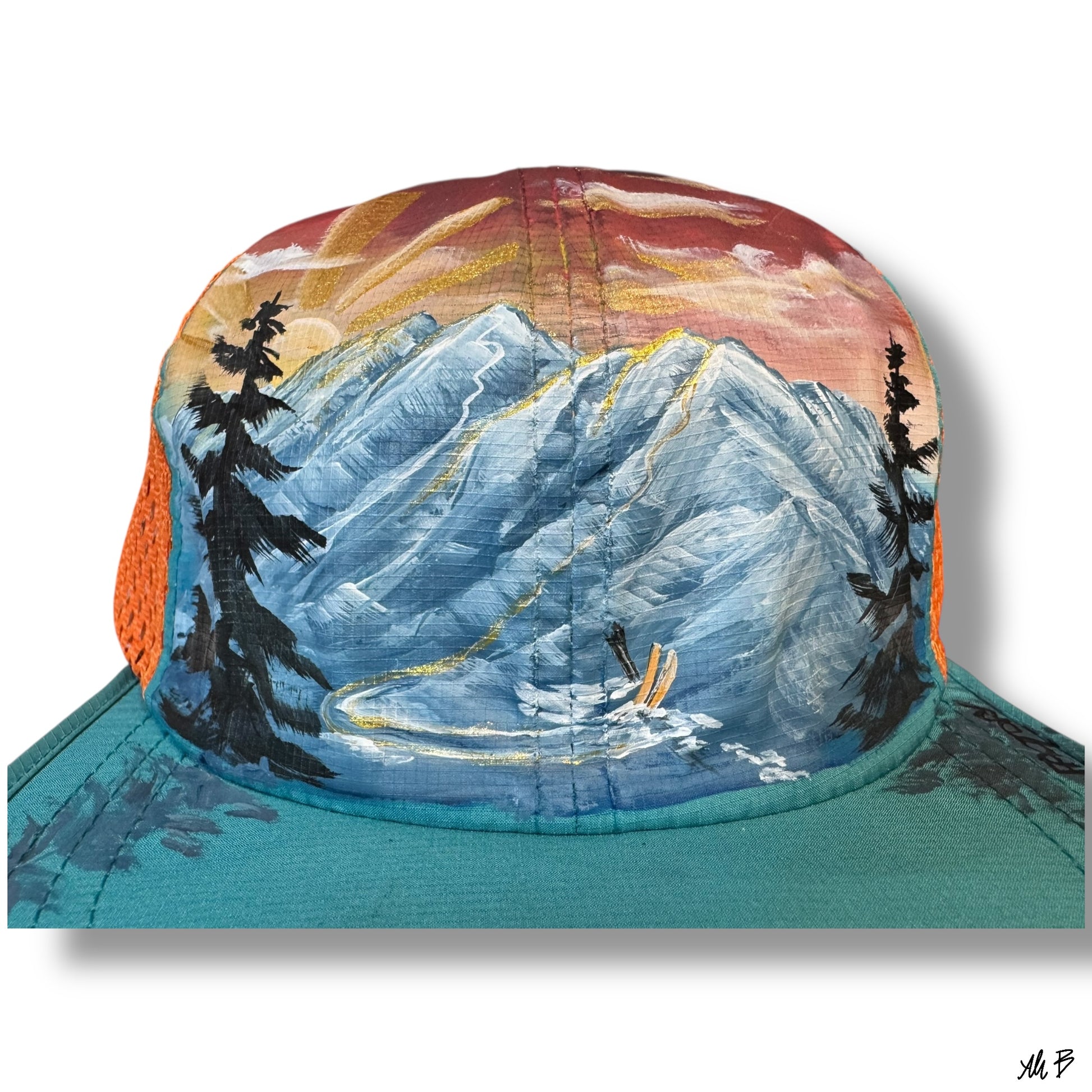 The sun is out, metallic gold rays expand across the sky above the snowy mountains. There is a pair of skis propped up in the snow and the trees leave a shadow on the bill of the hat.