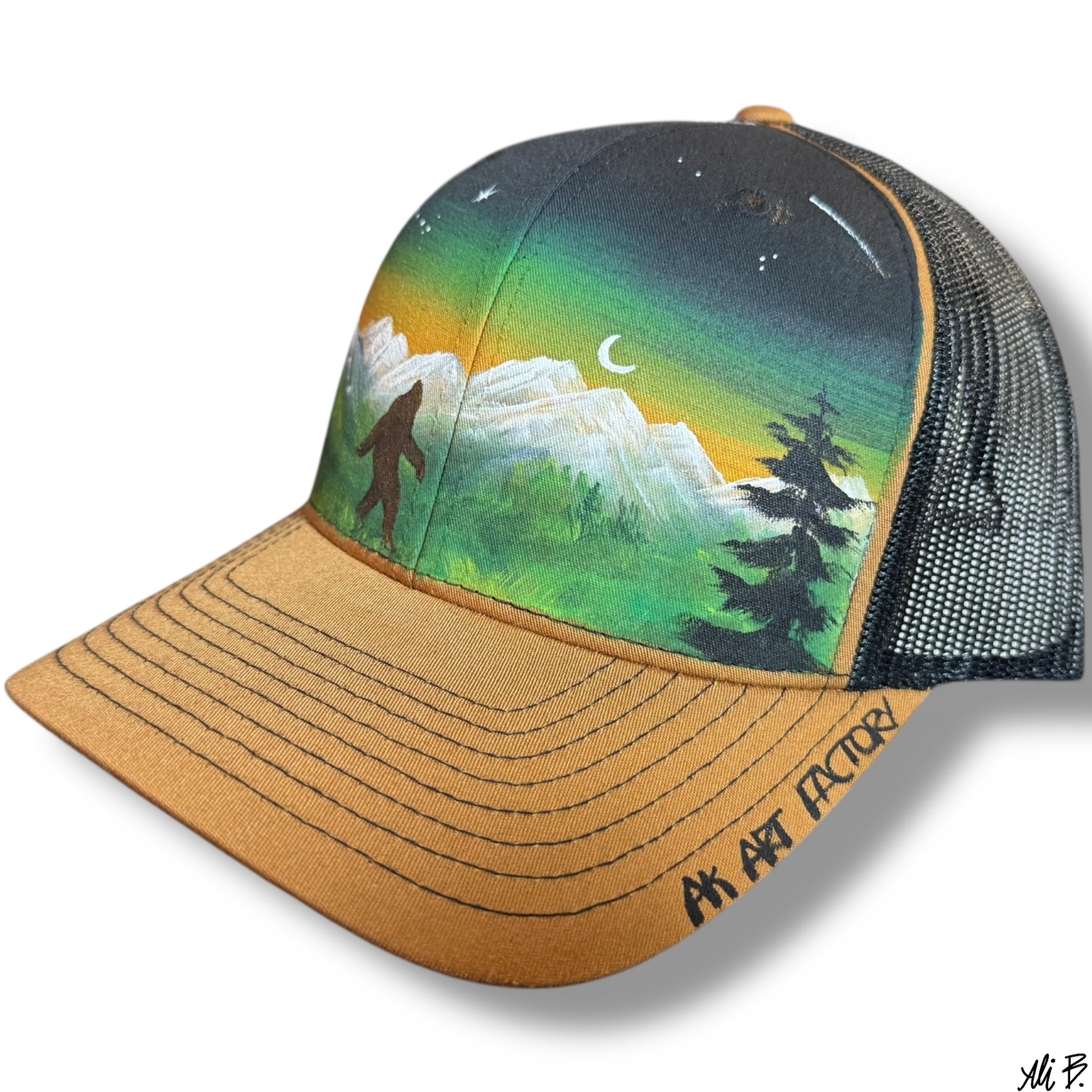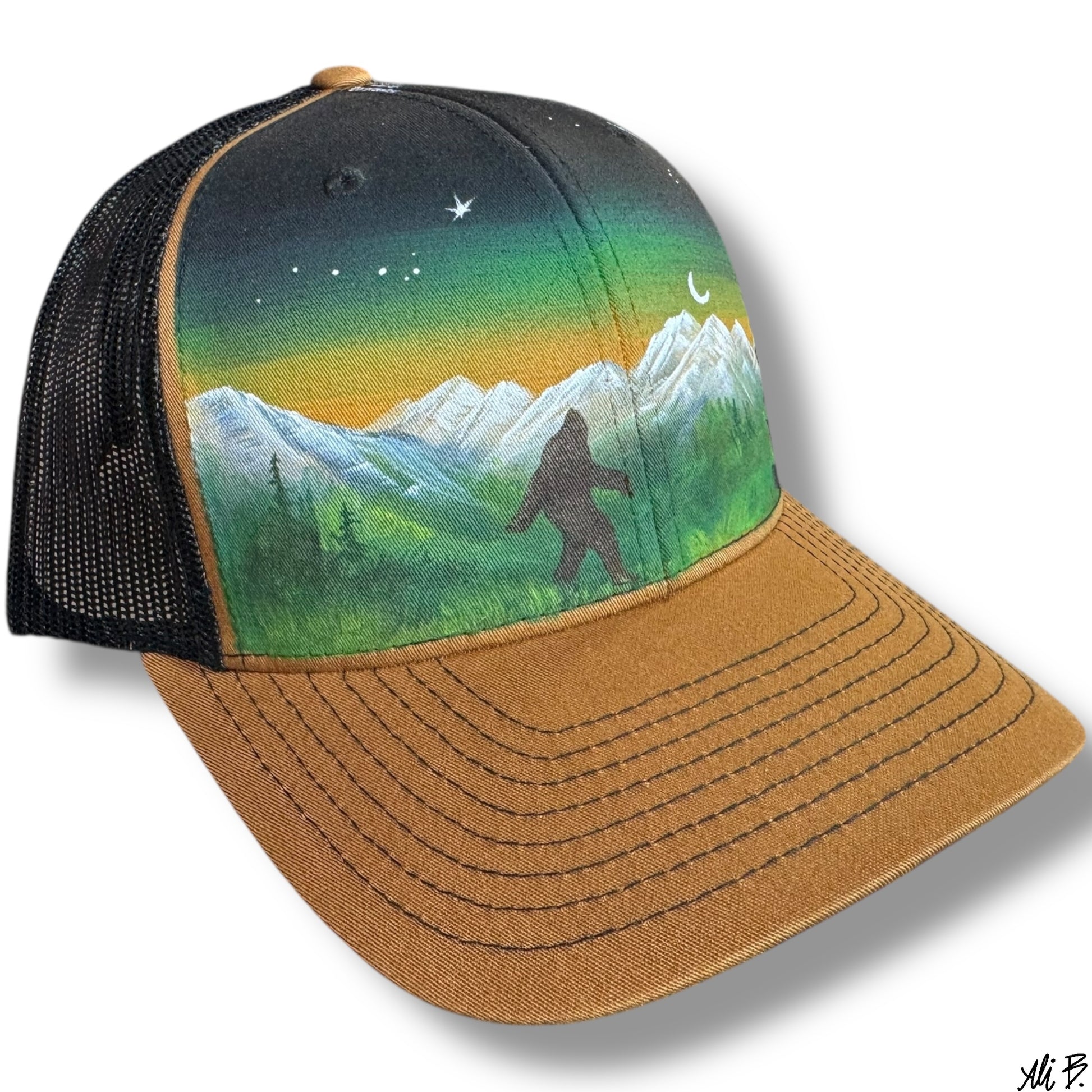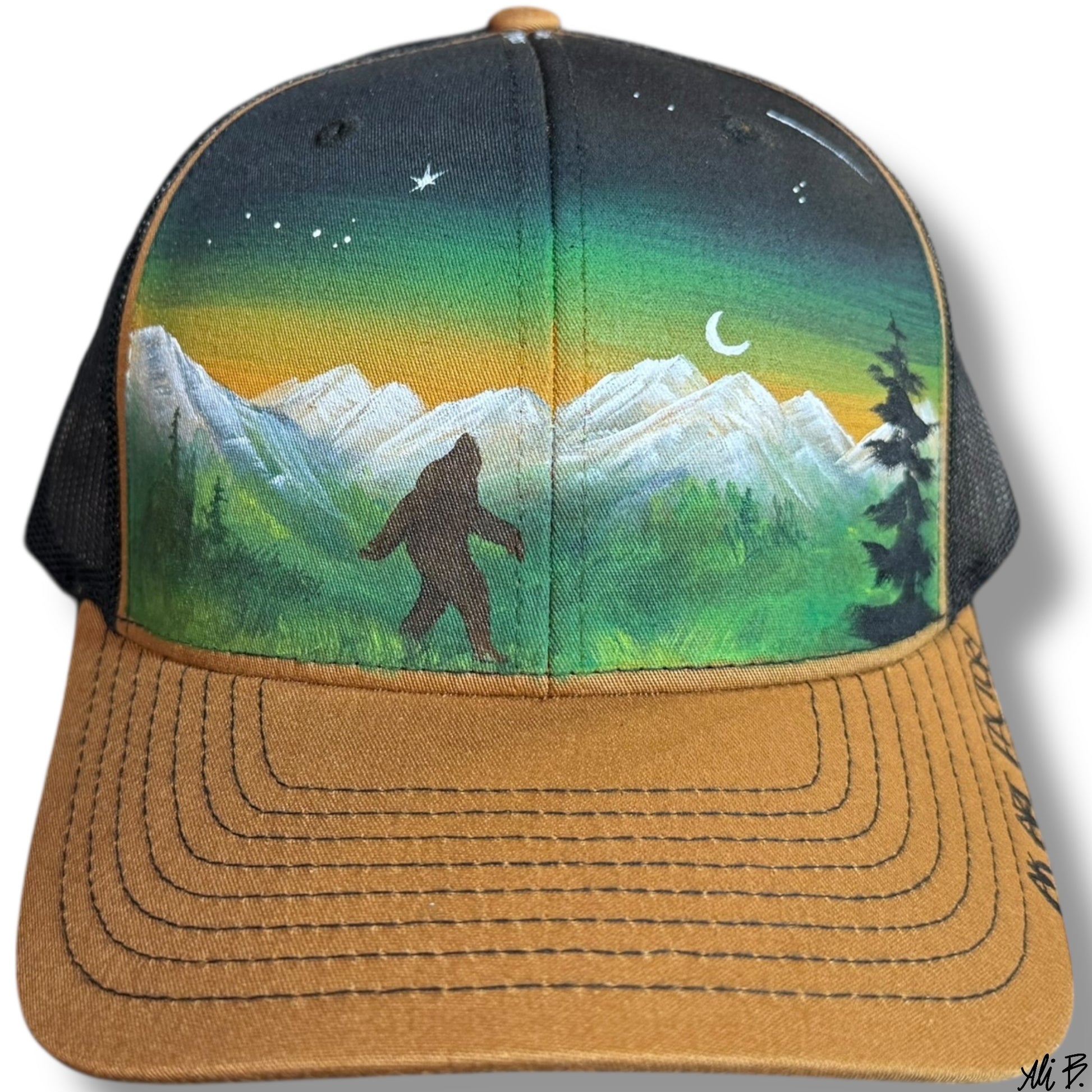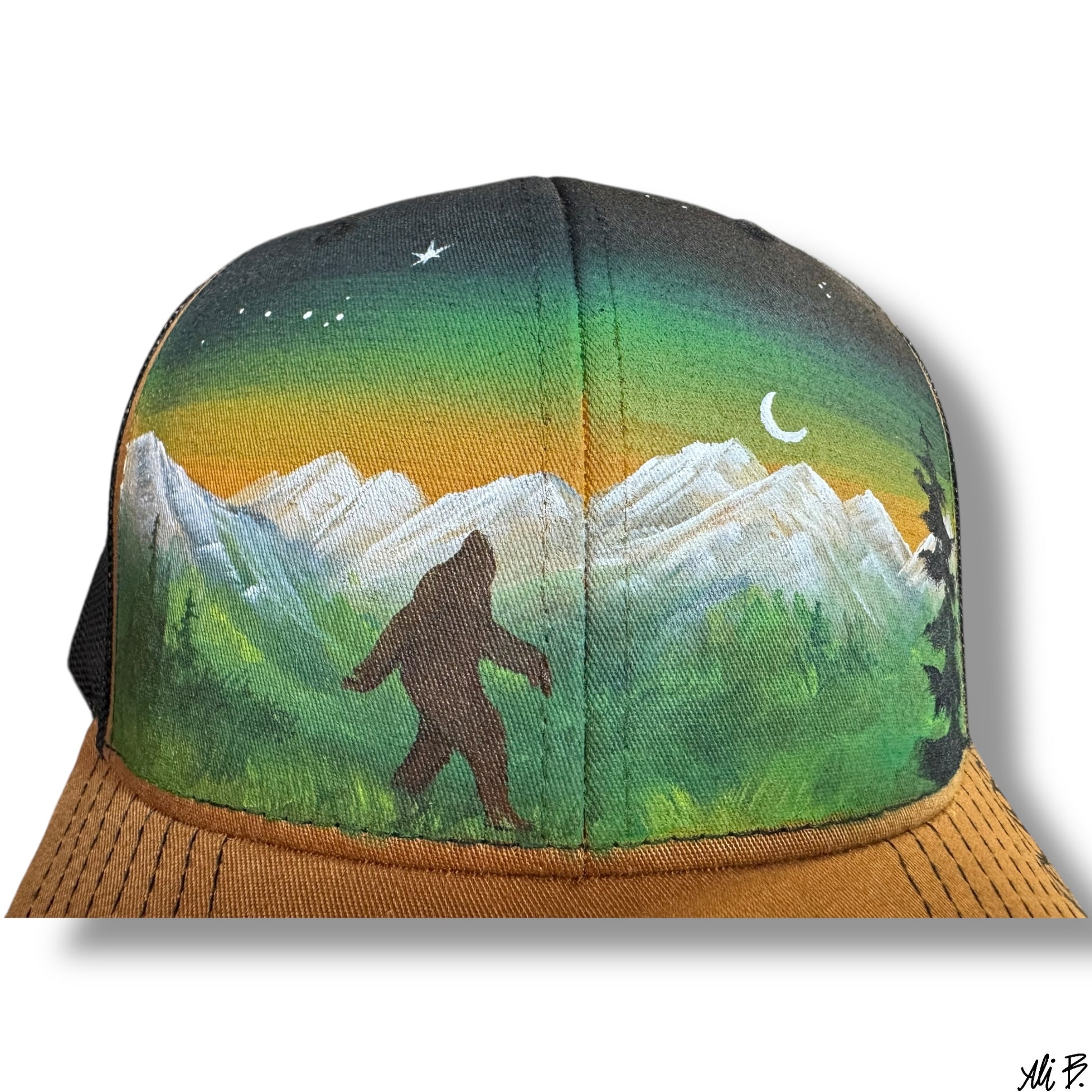 This hand painted hat is painted with warm colors of greens and mustard yellow in the sky, making you almost want to eat it.. but if you did eat it, the Yeti would be sad because all it ever wanted was to be loved.
