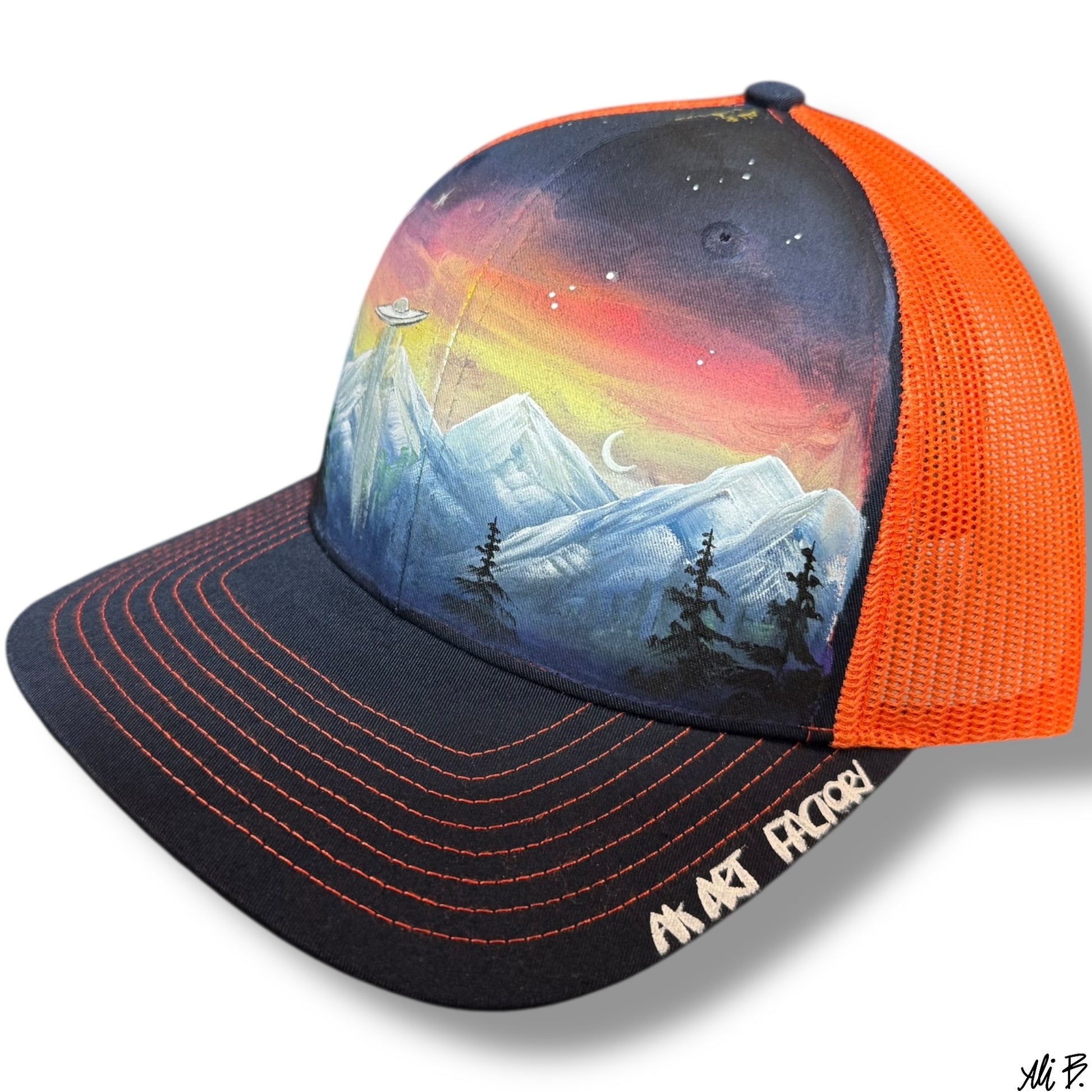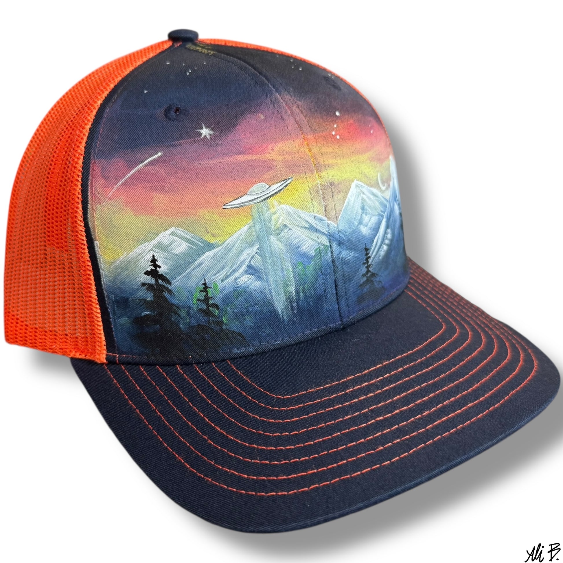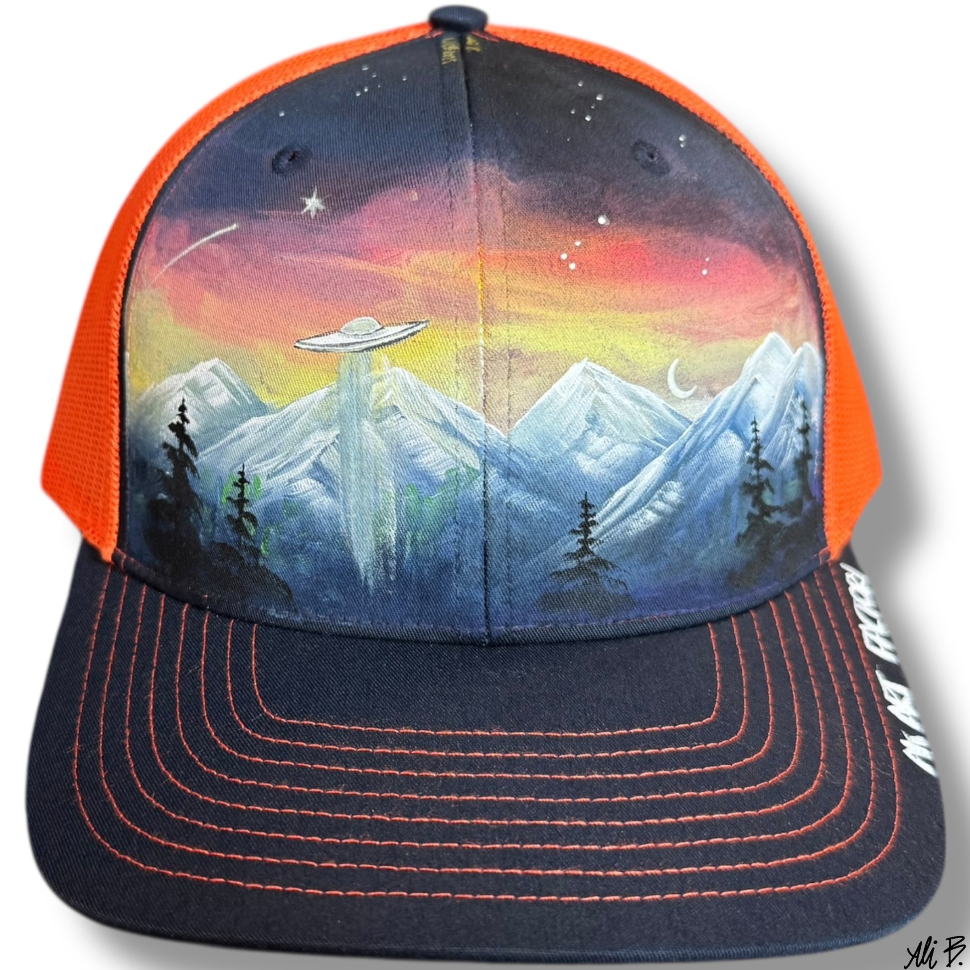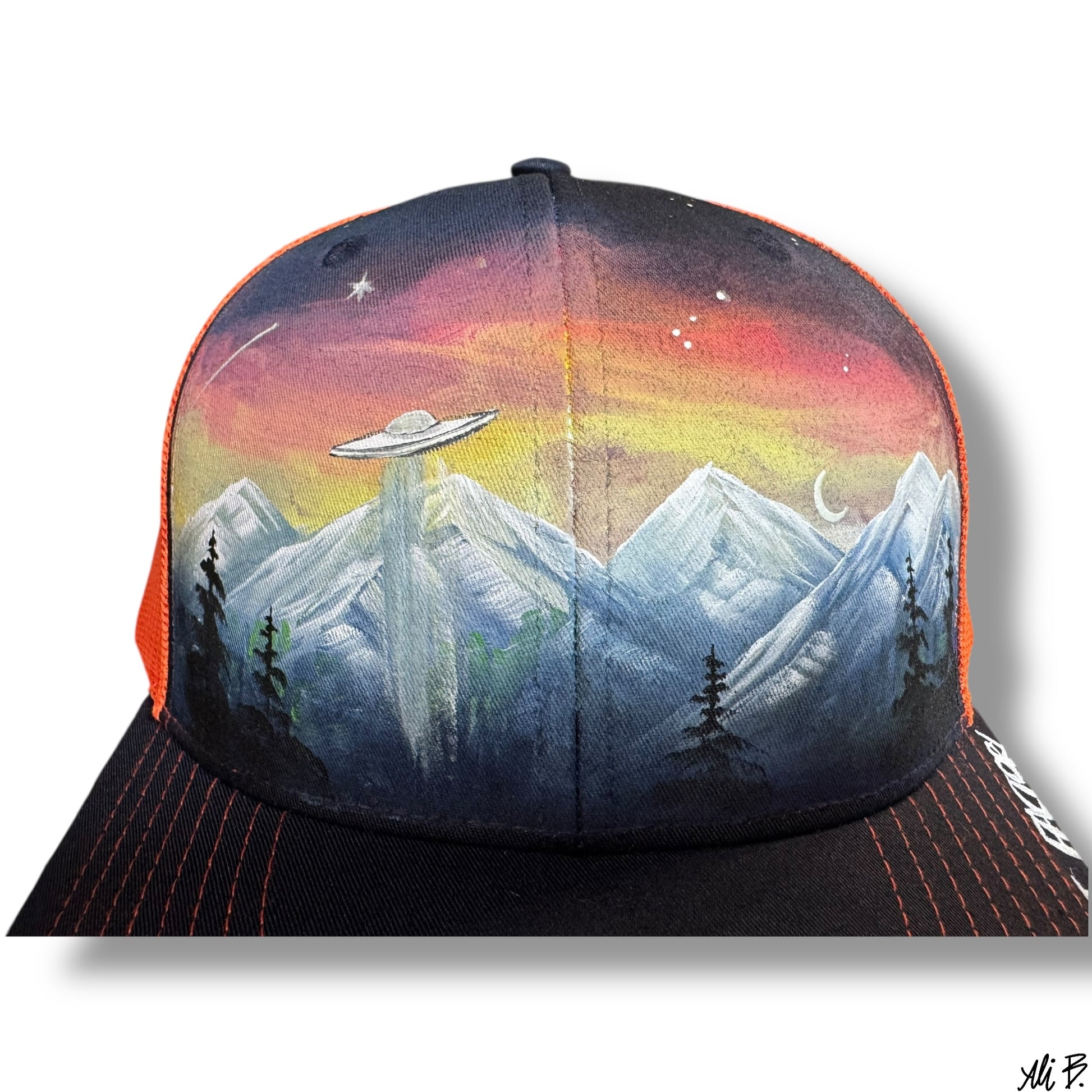 A UFO.. or whatever they are calling them now… silently soars through the pink-ish yellow sky, making its way through the mountains. You’d never even know it was there unless you saw the glow-in-the-dark beam coming down from this strange horseless carriage.