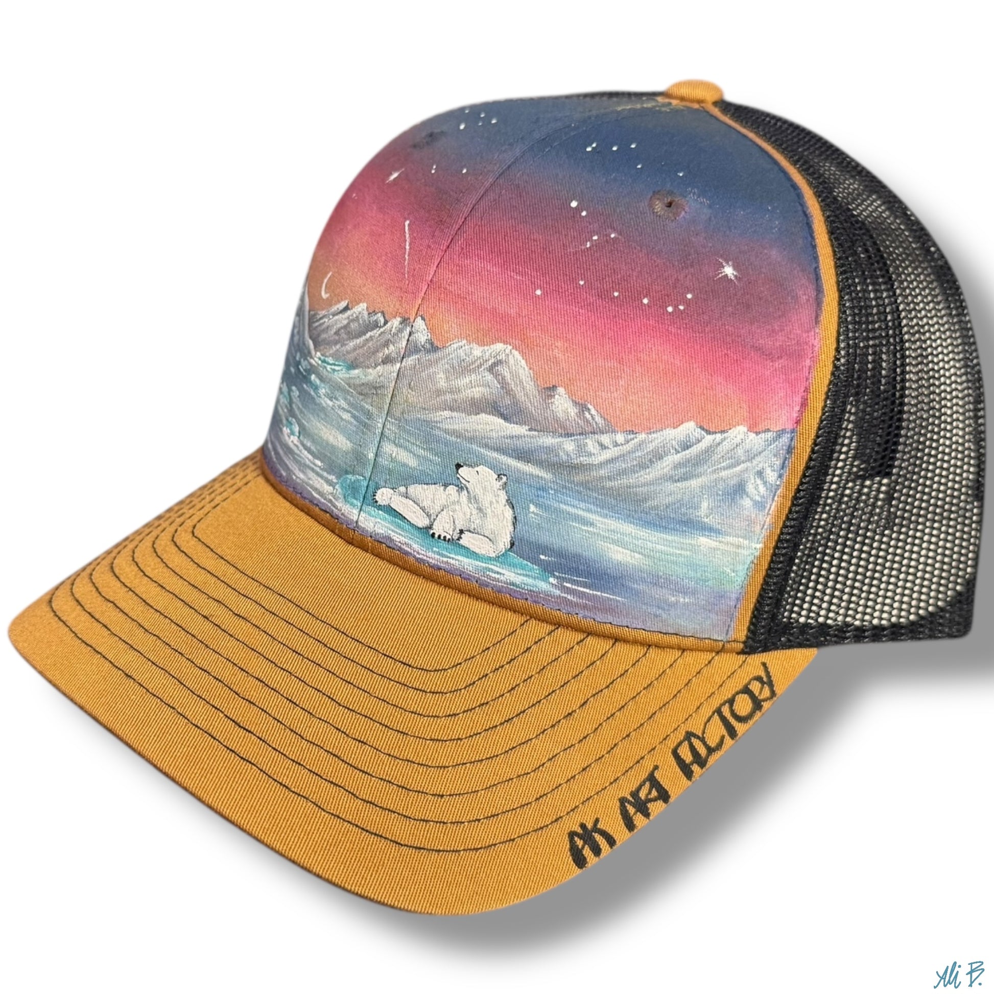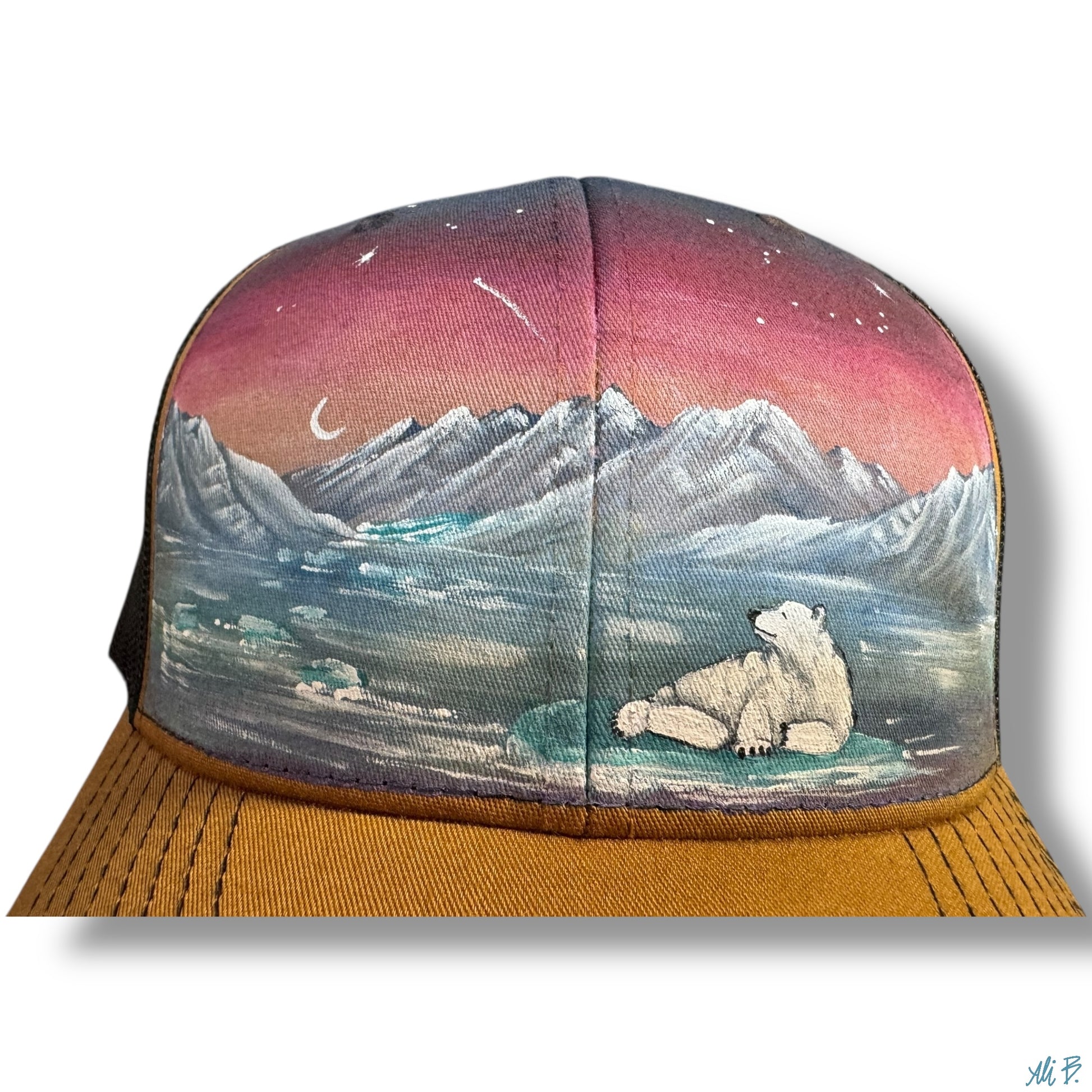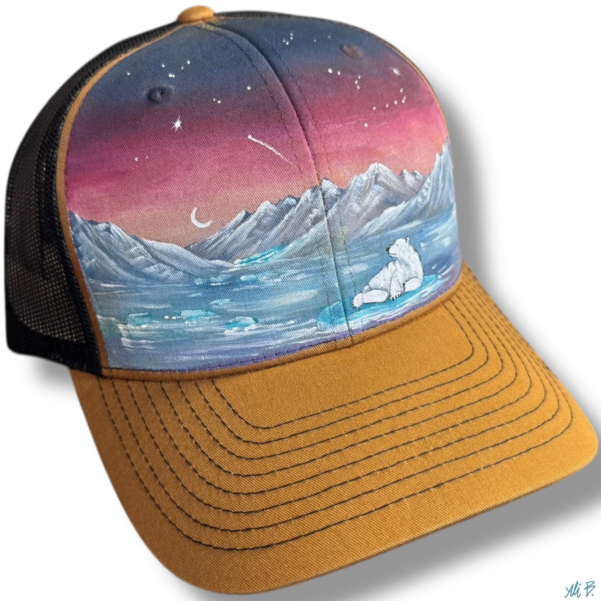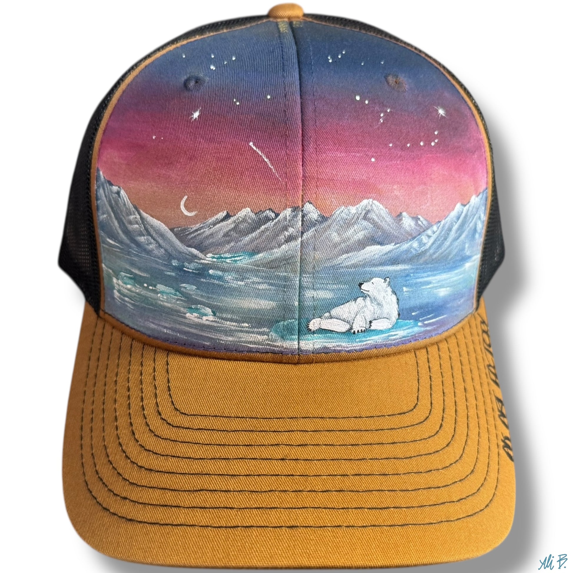 This polar bear quietly smiles, laying on top of a floating bergie bit, gazing at the shooting star, just chillin’.