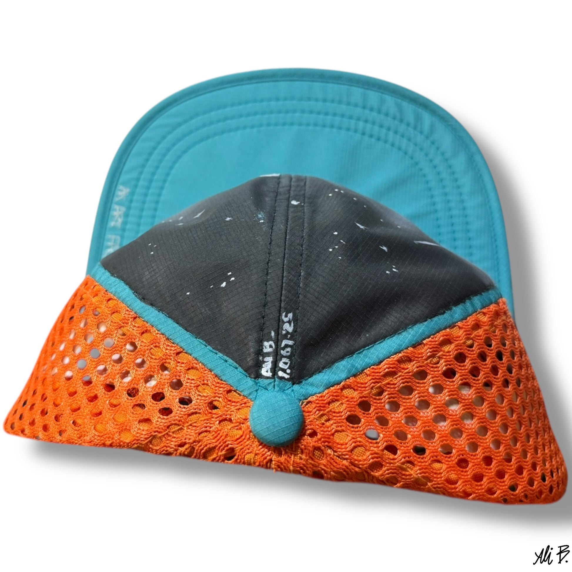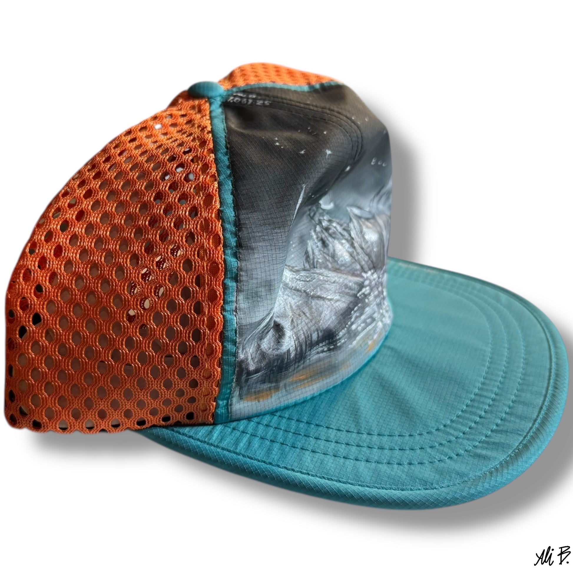 - Color: Orange mesh backing, turquoise bill