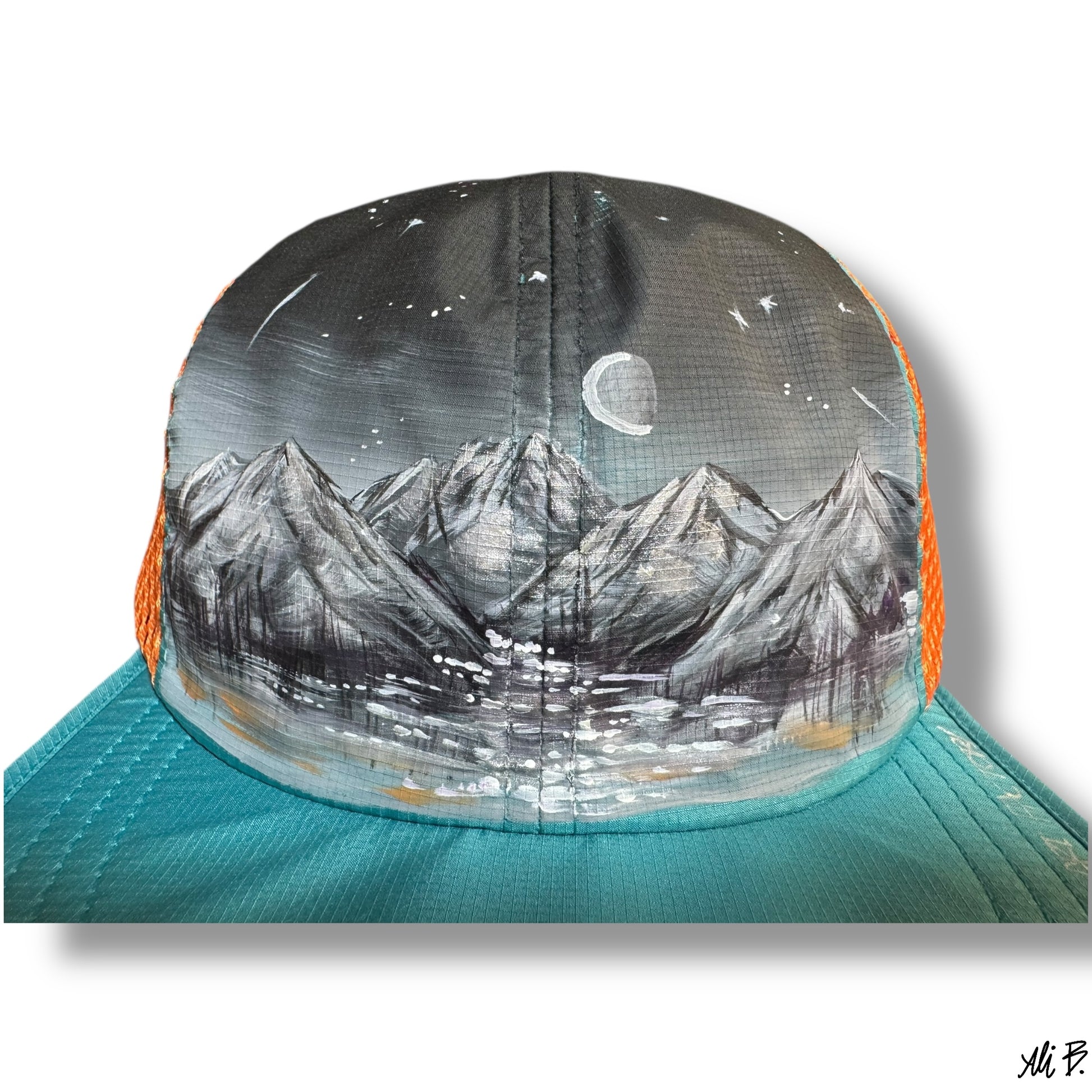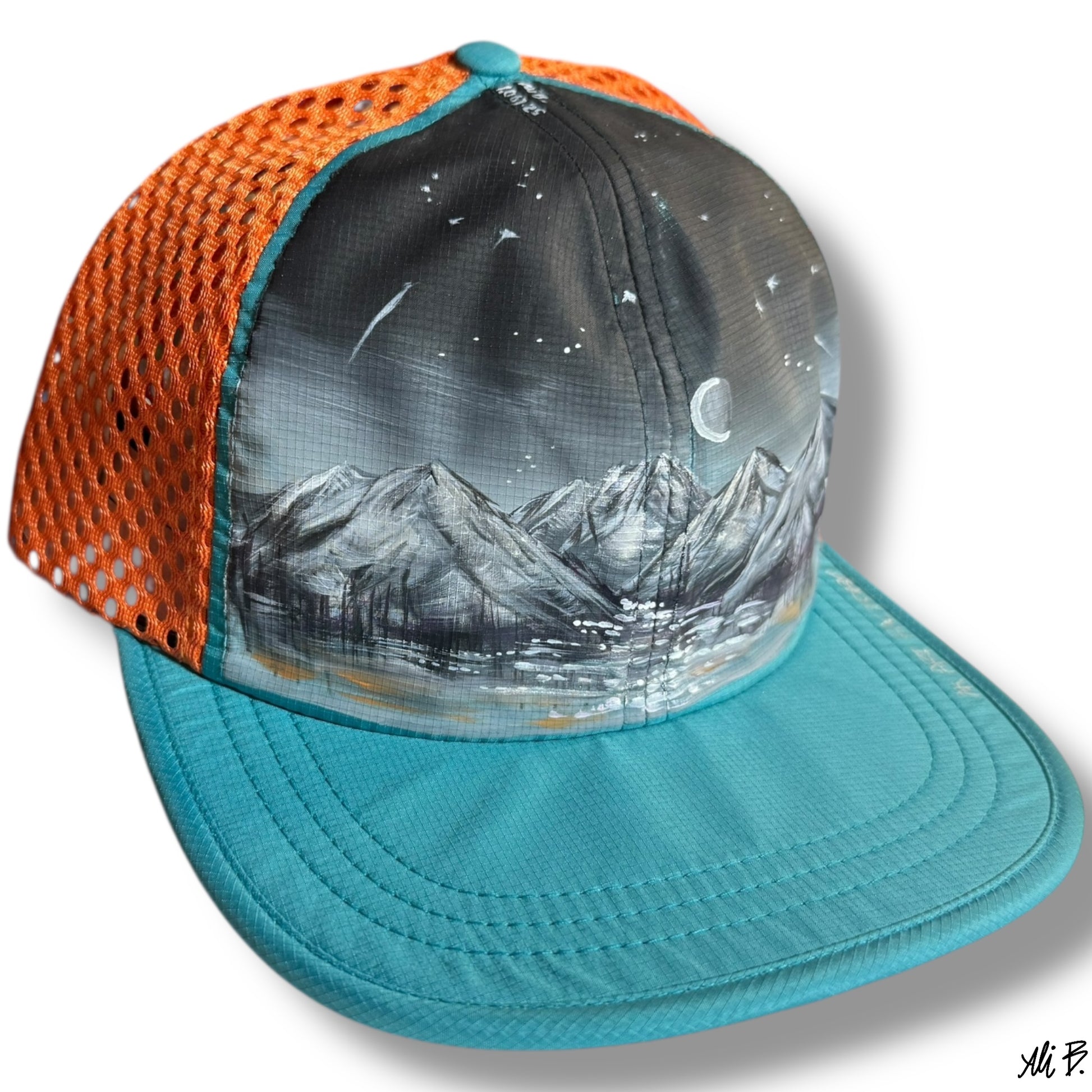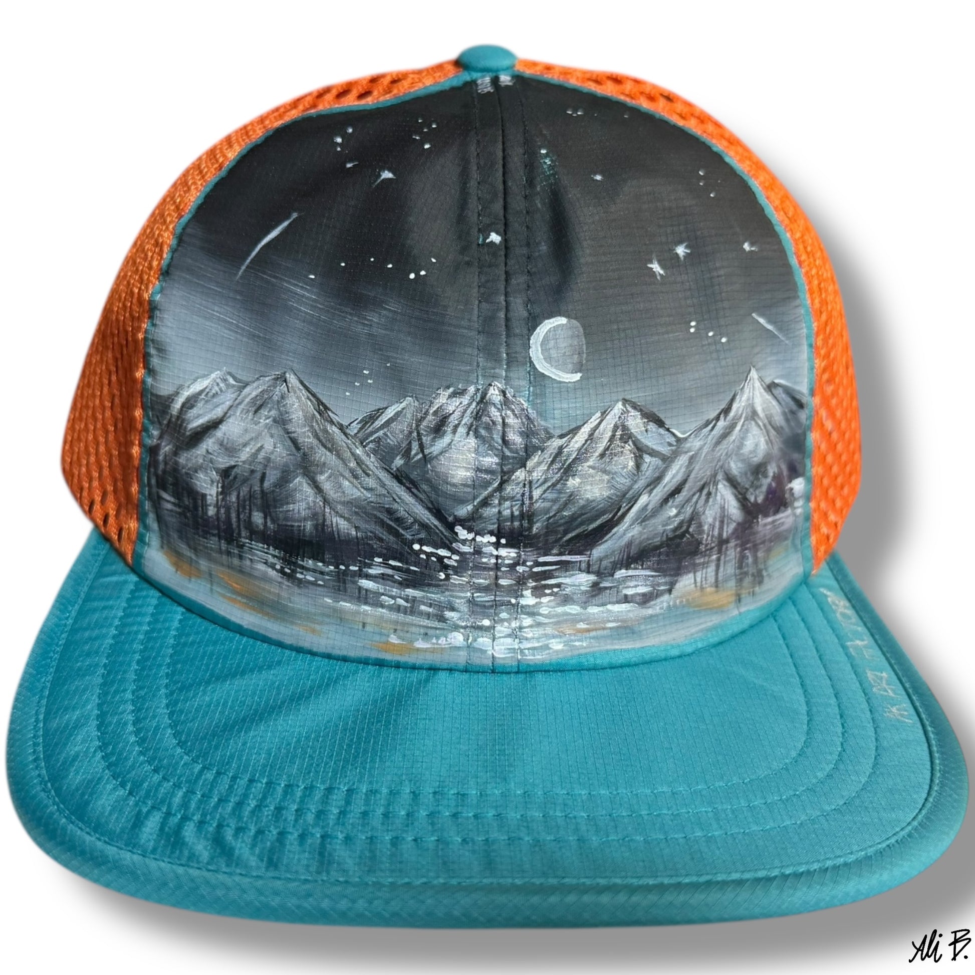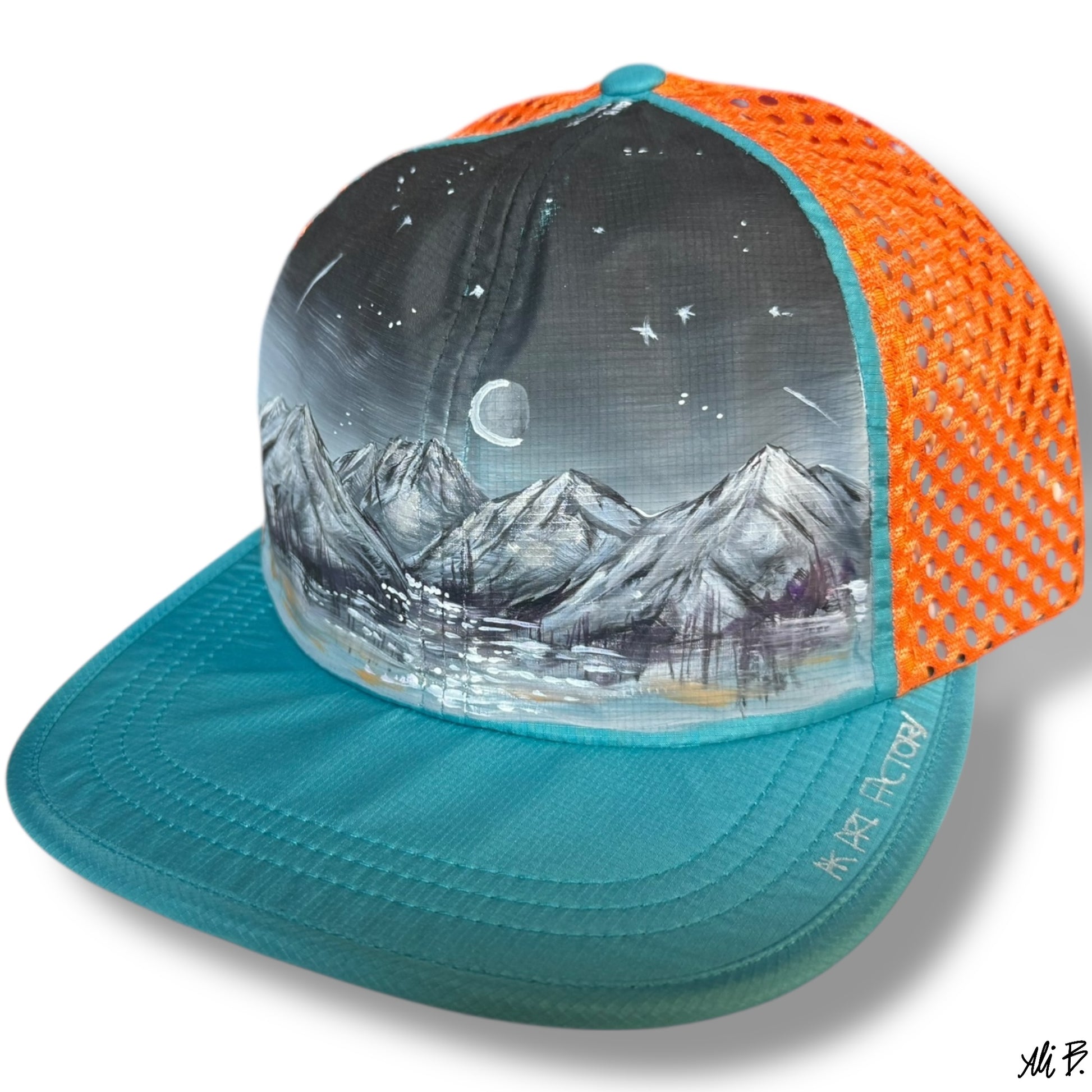 Is it midnight or is it 4pm in Alaska?.. This hand painted hat represents the dark Alaskan winter nights, where blackness takes over and there is a little bit of magic sprinkled across the sky and silver metallic paint reflecting from the moon.