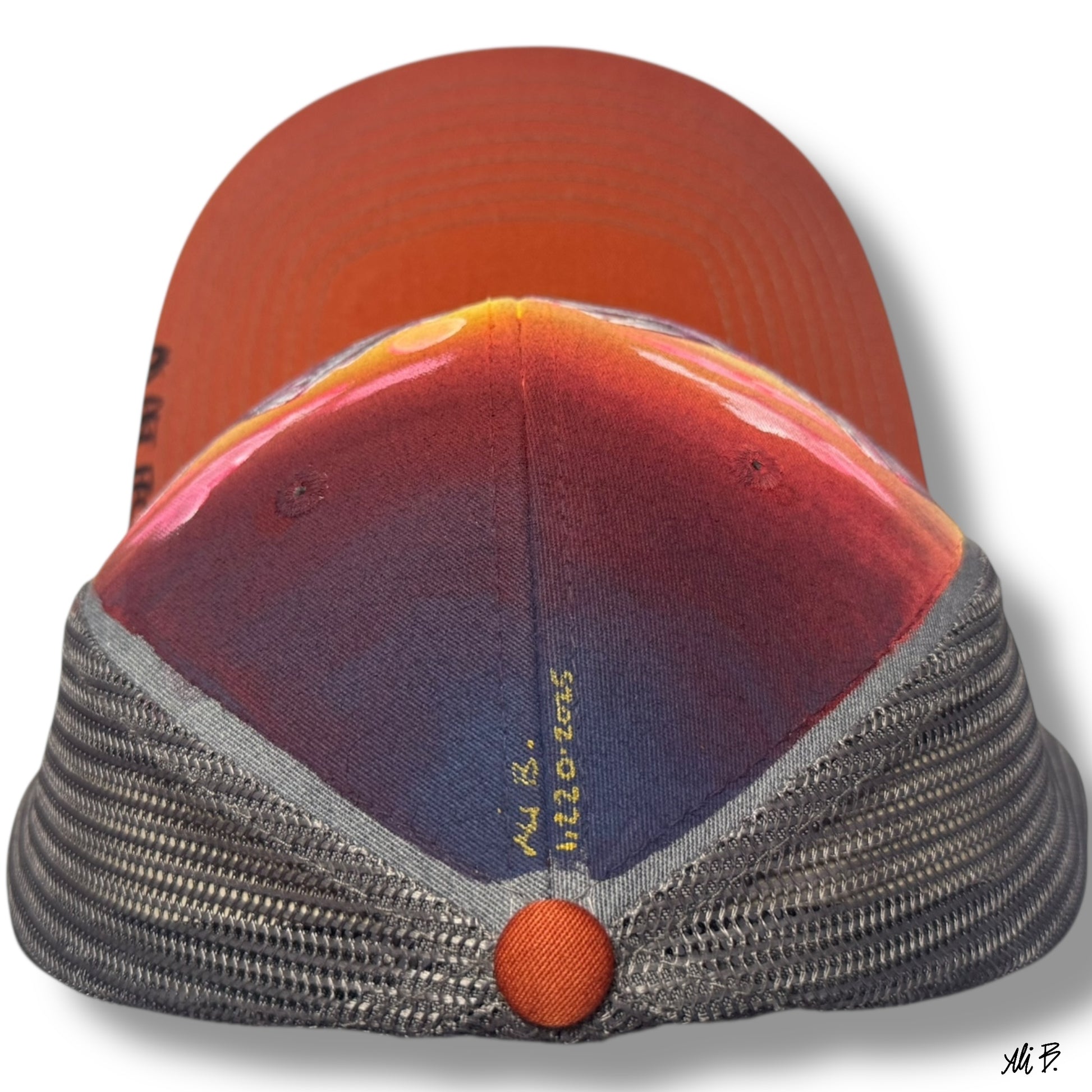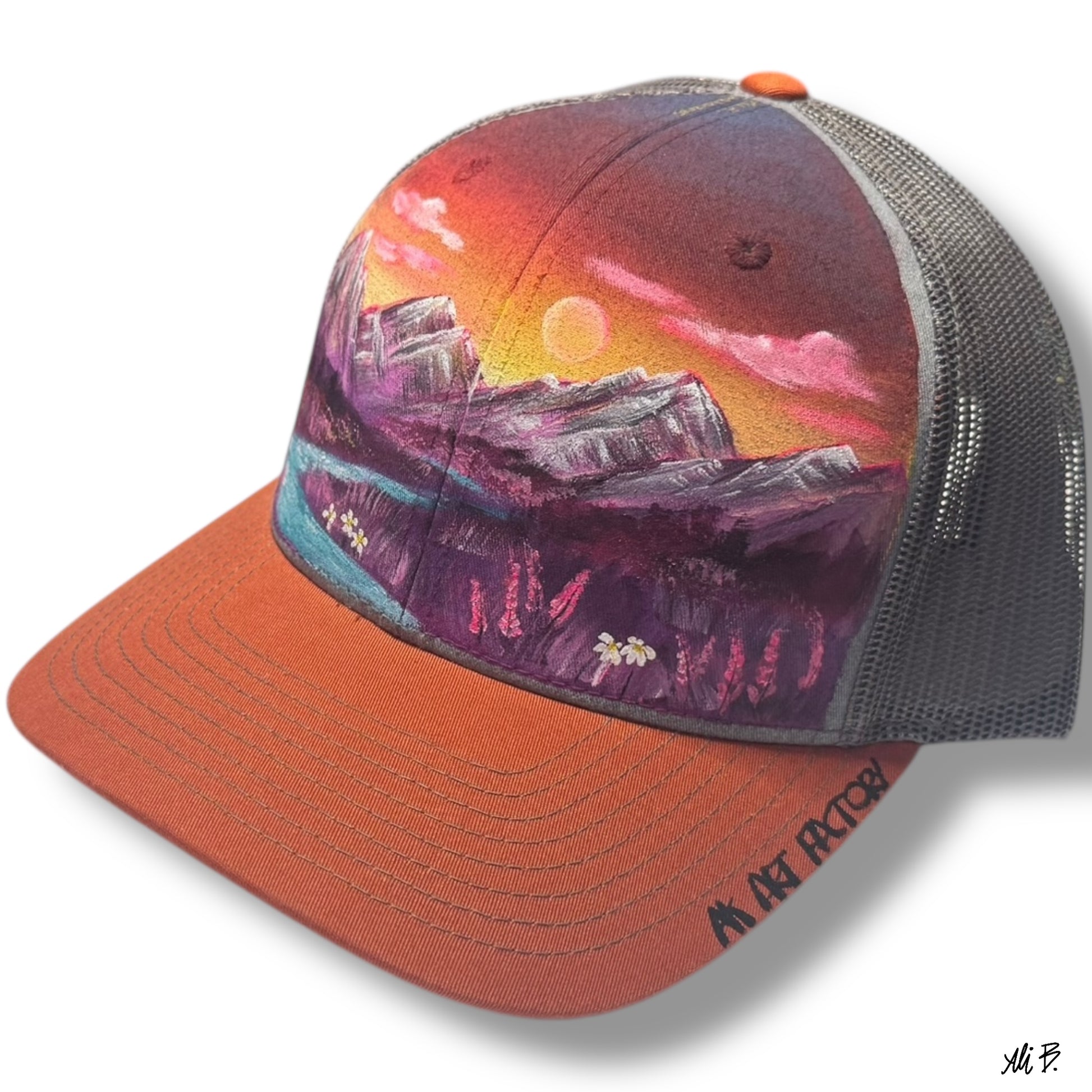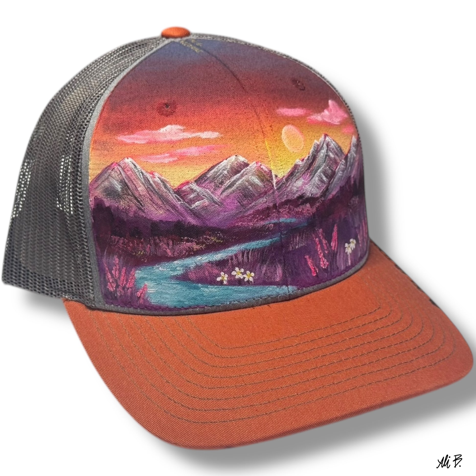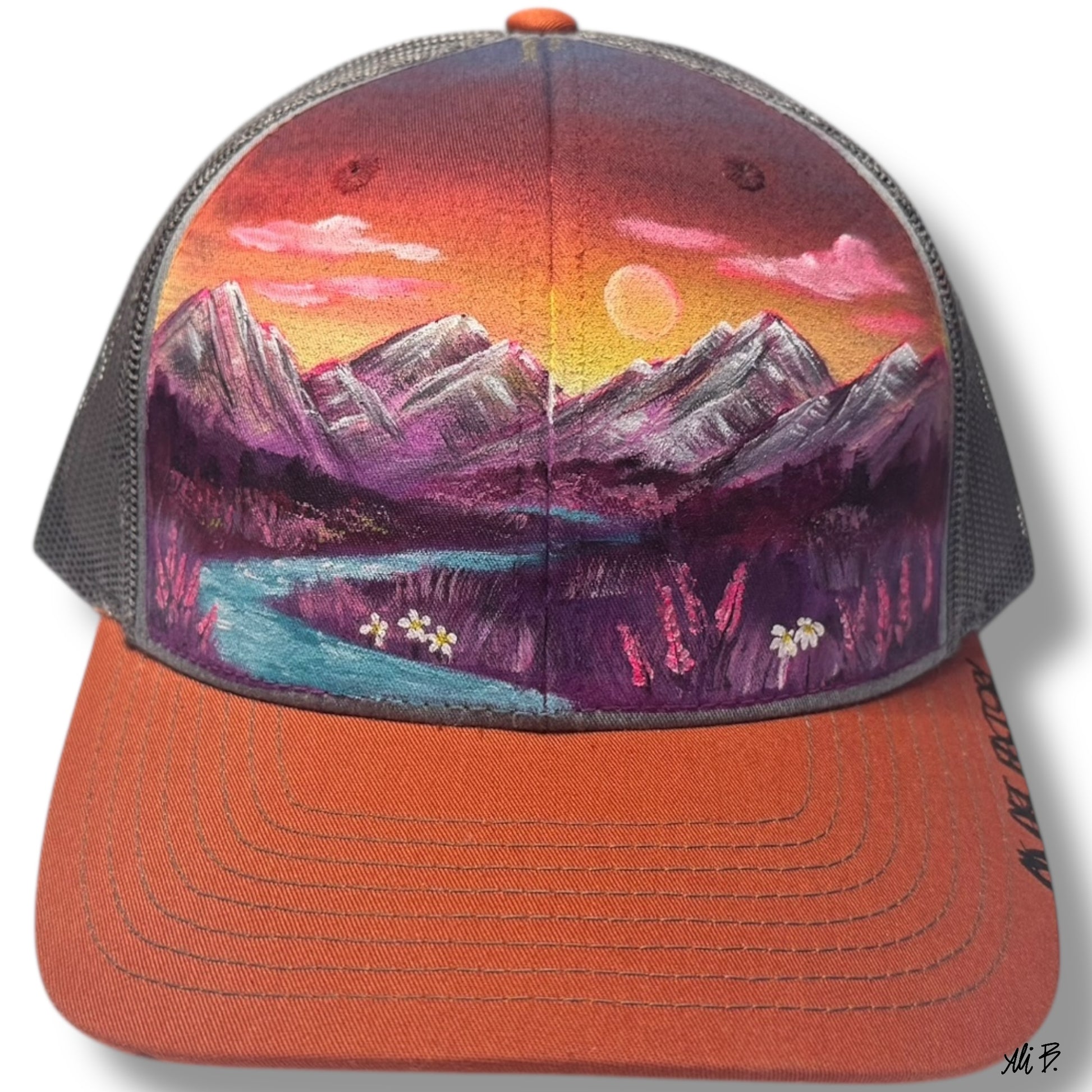 This hand painted hat pops with bright pinks and purples, the river flows toward the bill of the hat while fireweed and daisies dance around the tall grass. There is black light paint on this hat, making you the life of the party!