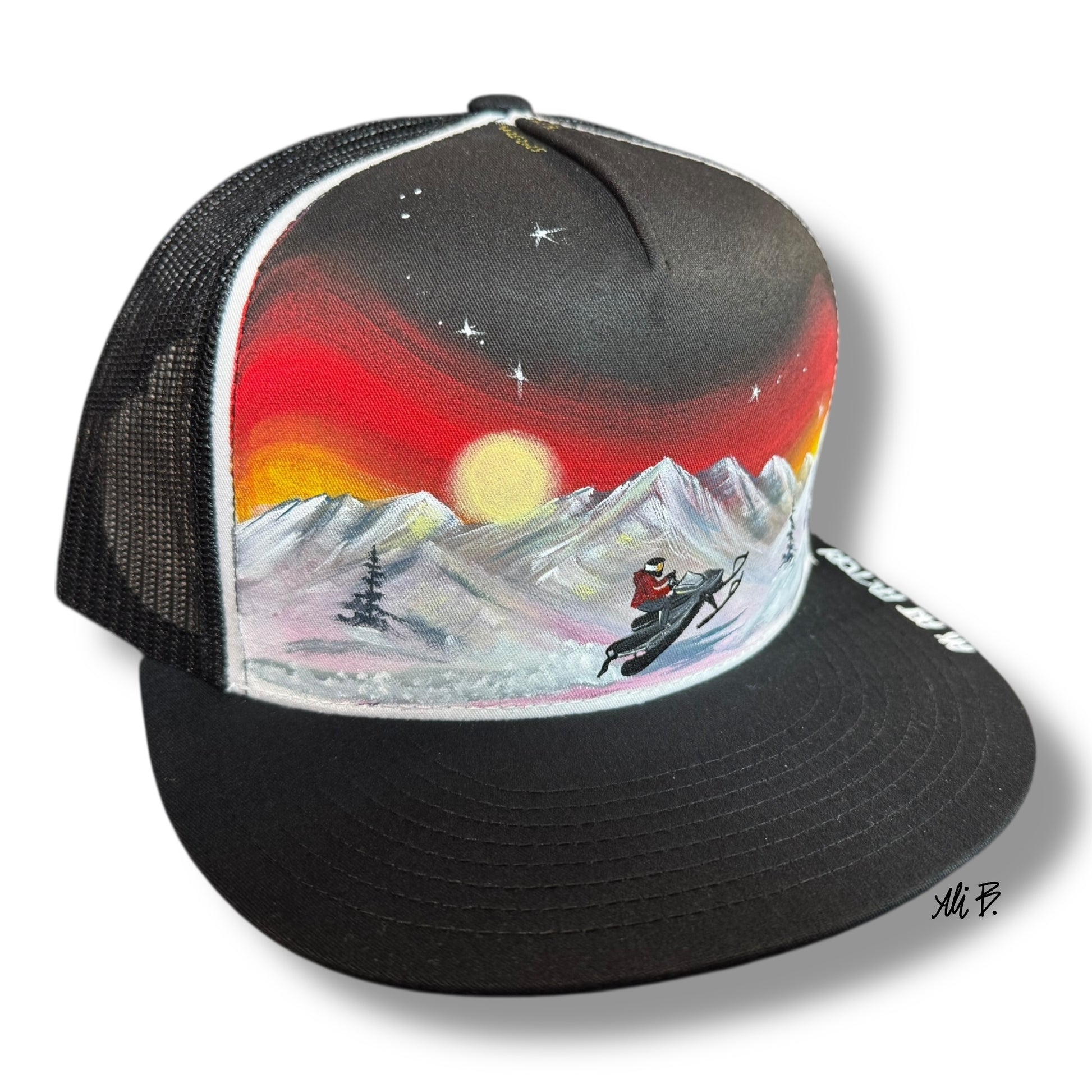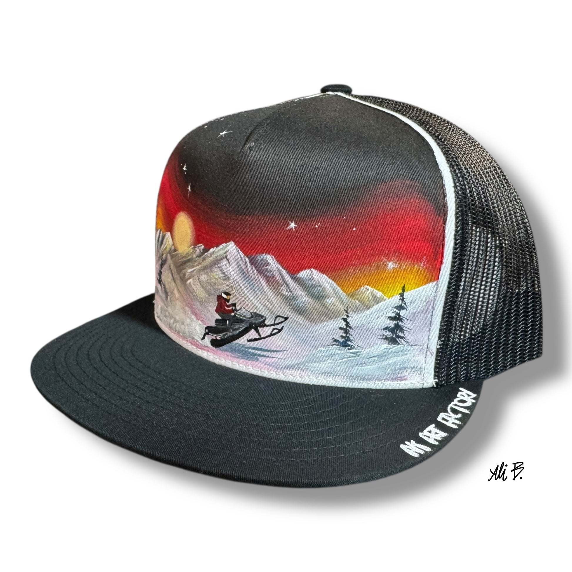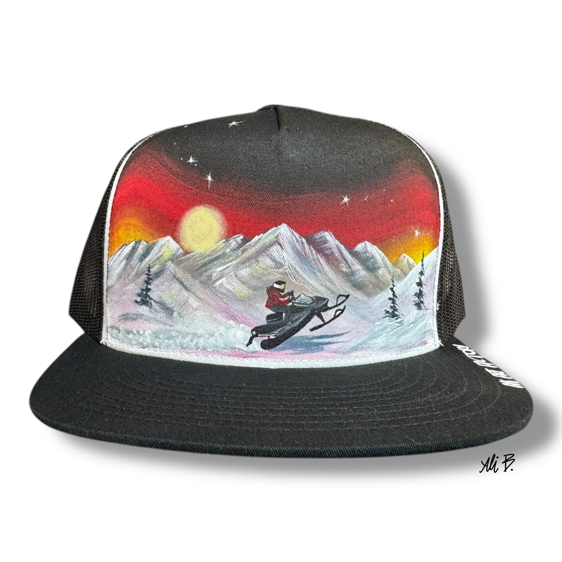 A silver shimmer in the air, the cold sun hangs, a distant stare. A sudden rumble, sharp and deep, while drifts of powder softly sleep. Then, a flash of red a black, a rooster tail along the track. The snowmachine tears the quiet apart, a powerful rhythm, a pounding heart. The driver leans, a shadow fast, the forest blur, too quickly passed, “Braaaap!” The sound, a joyful cry, as stars scatter across the sky.