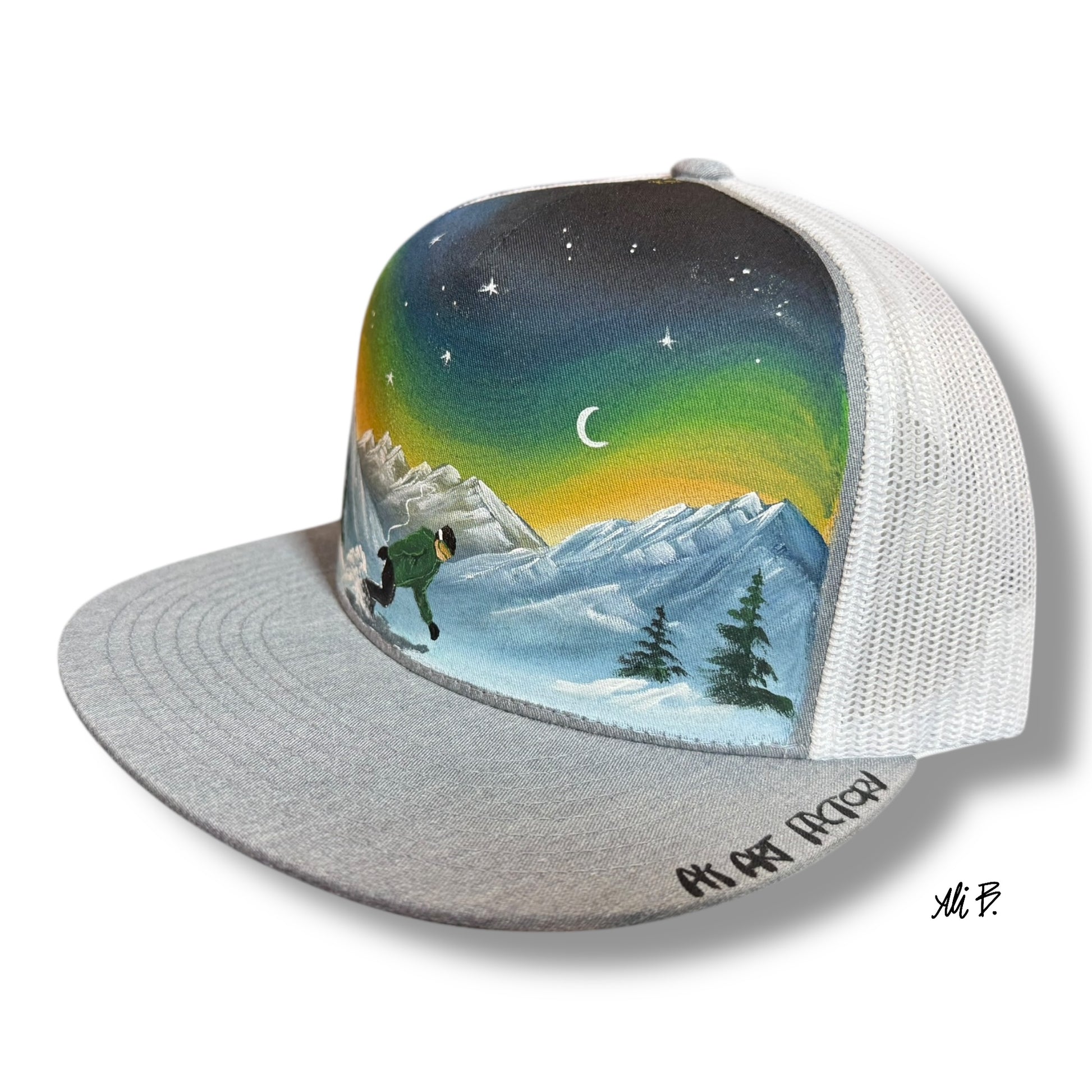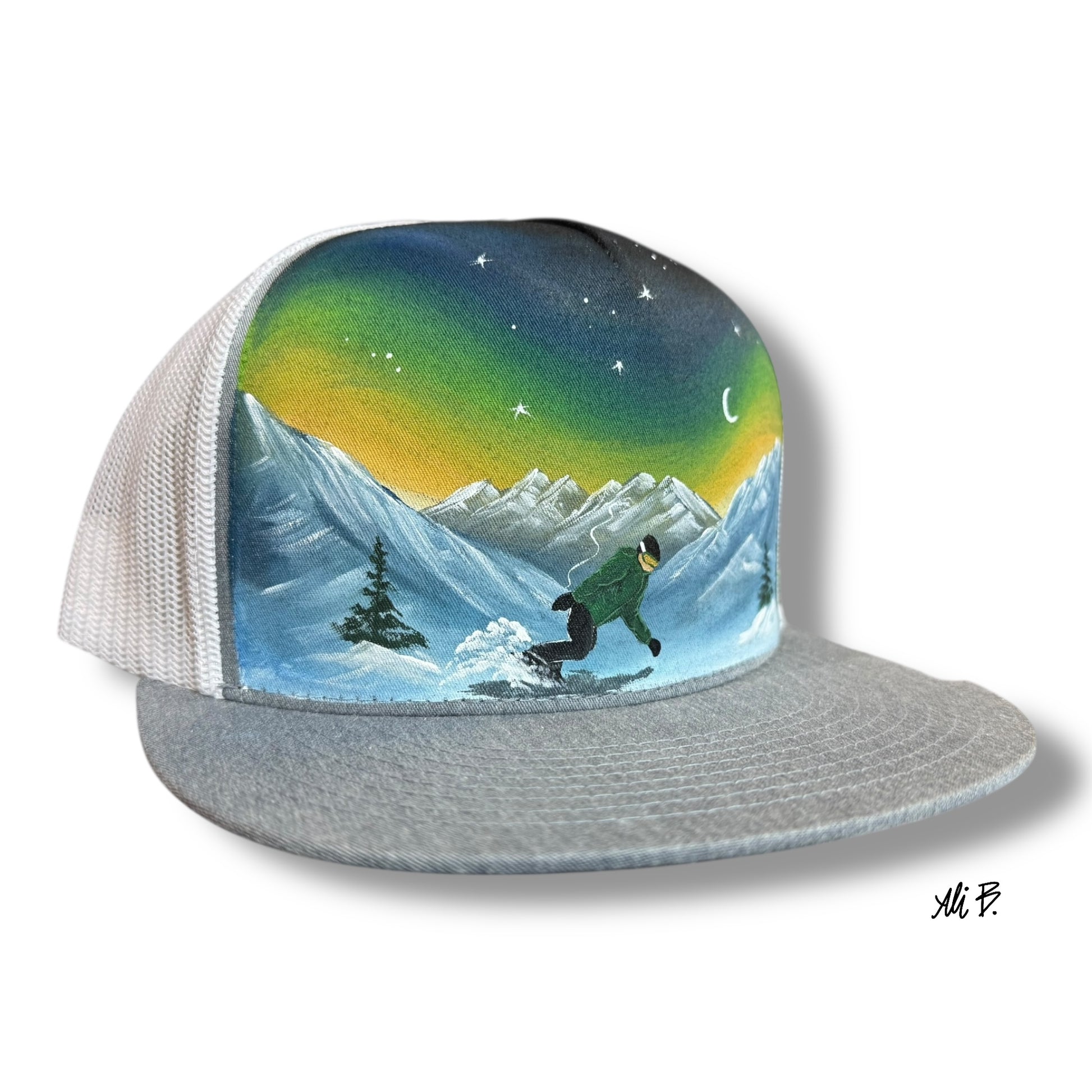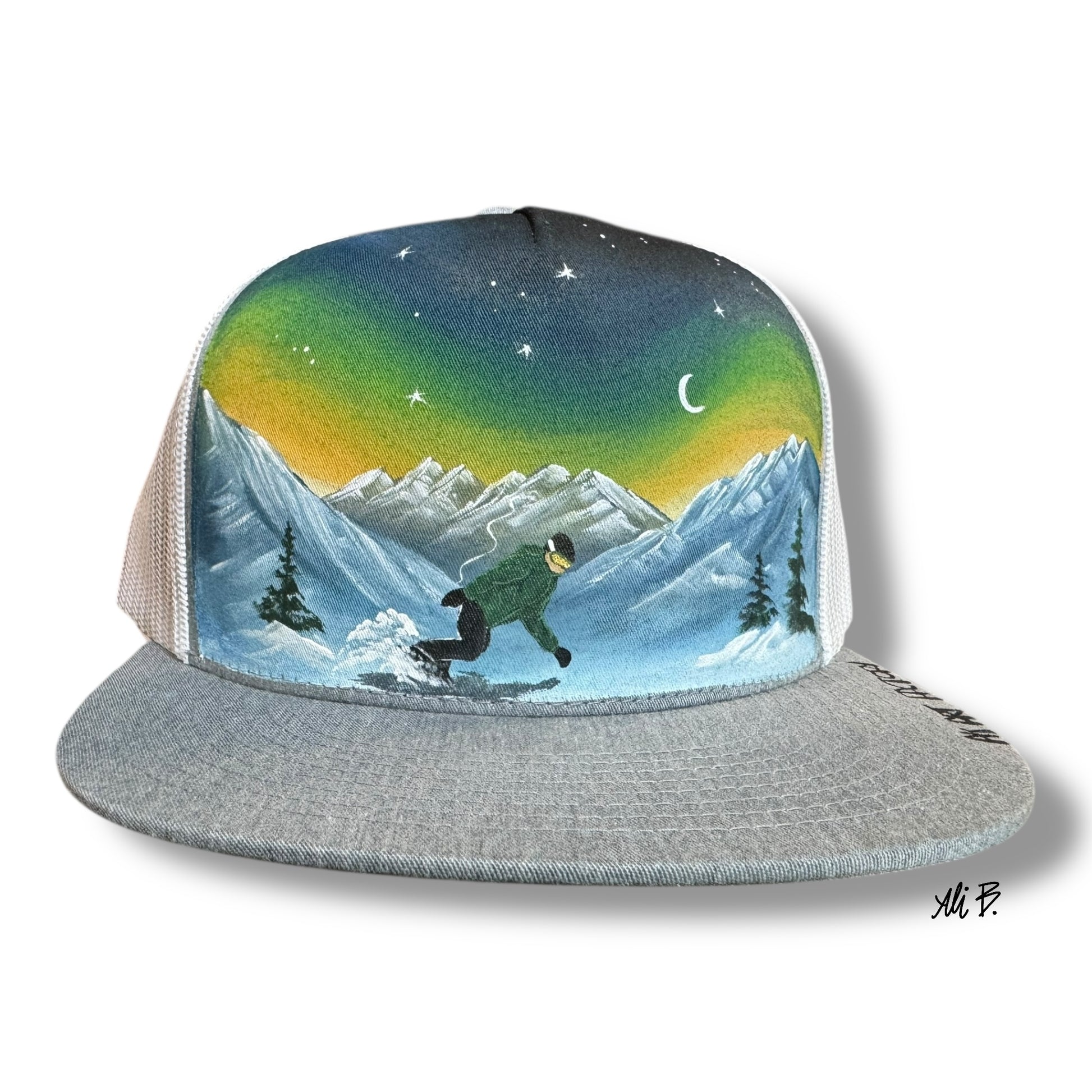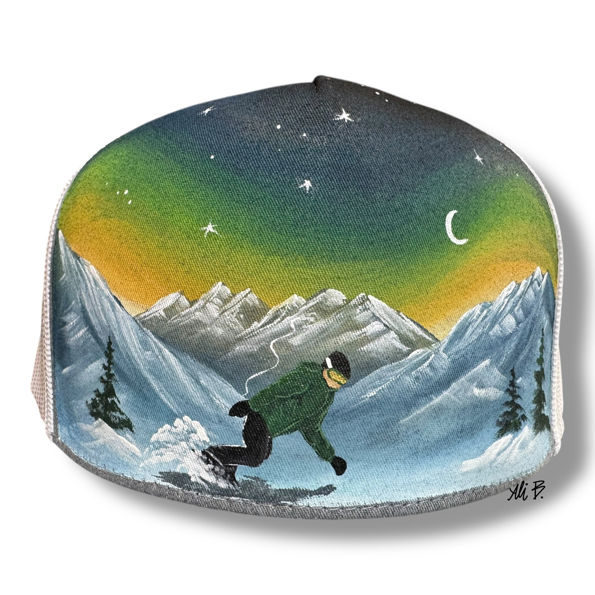 This snowboarder has had the best day ever and this painting captures their last run of the day (of course no one called it, because we all know that’s bad luck). The sky has a glimpse of the northern lights and a starry sky, while the powder sprays behind, leaving nothing but a tack leading down the tall mountains.