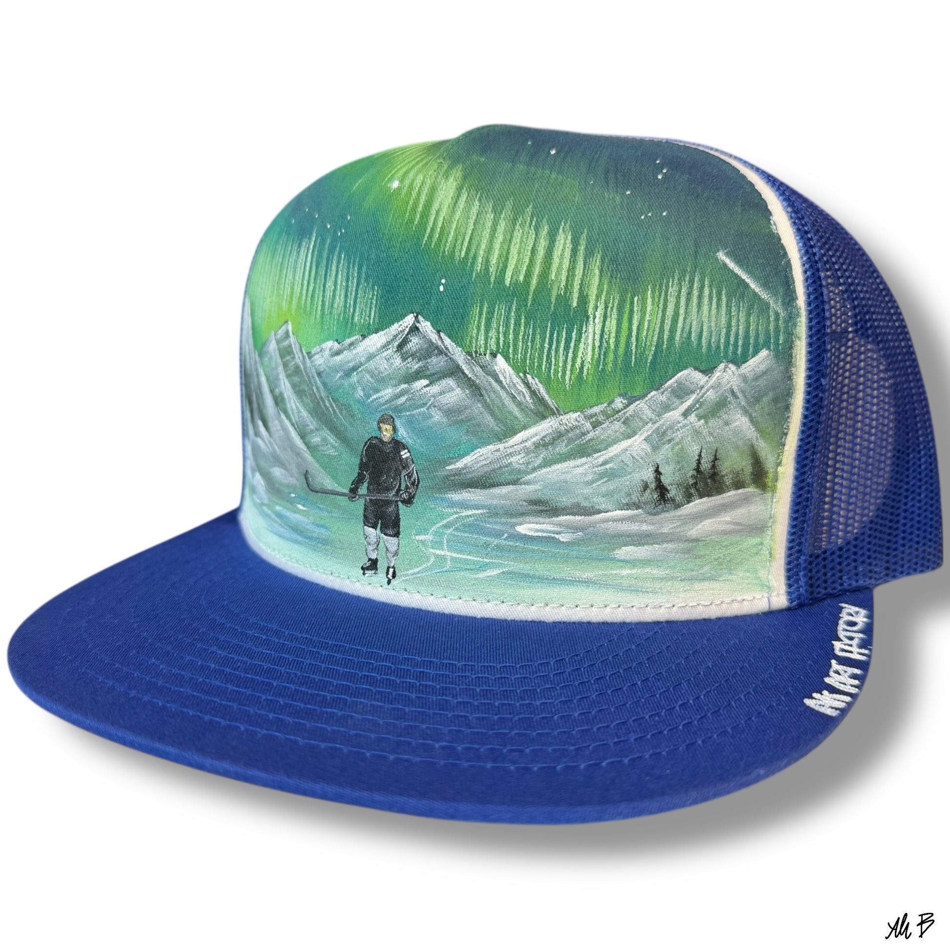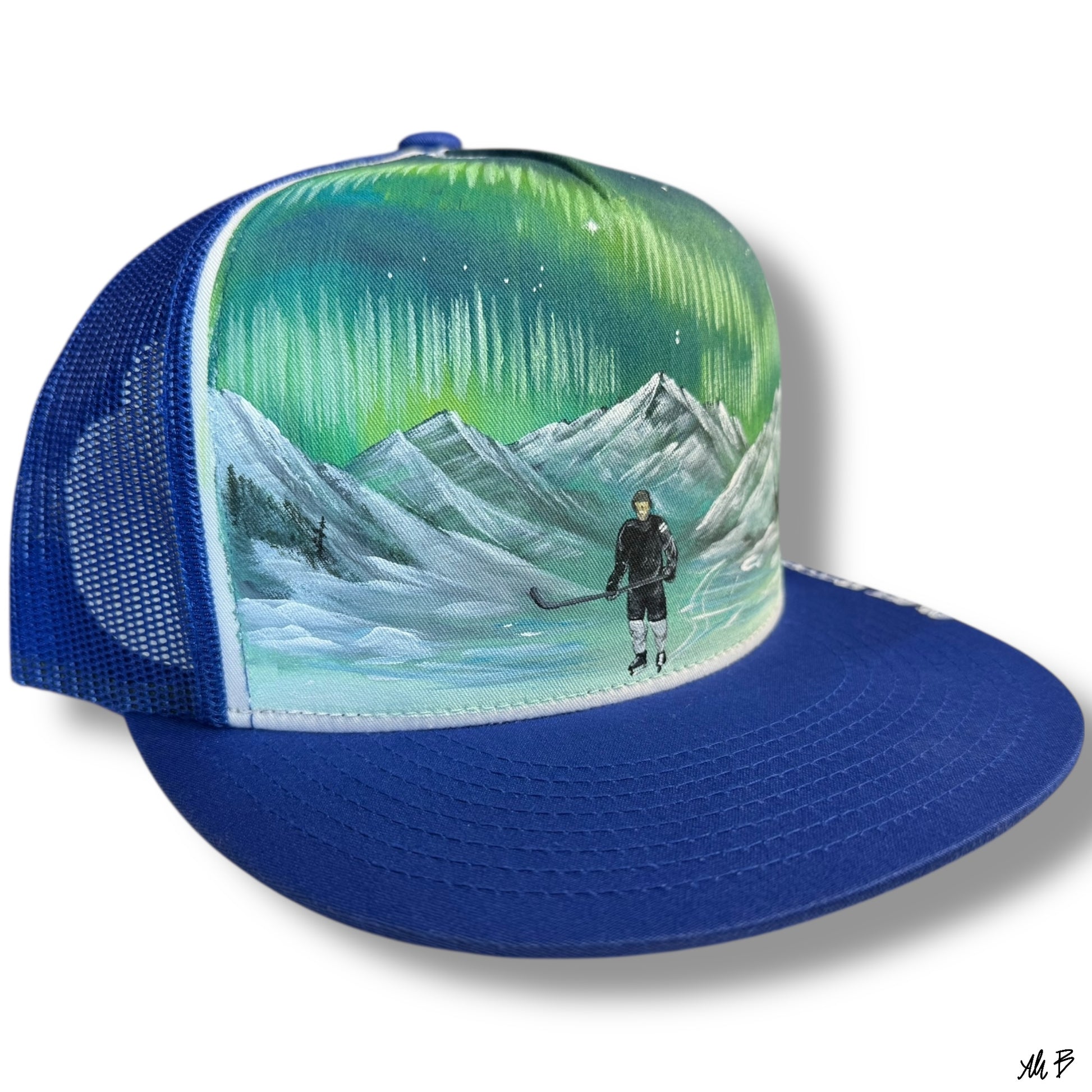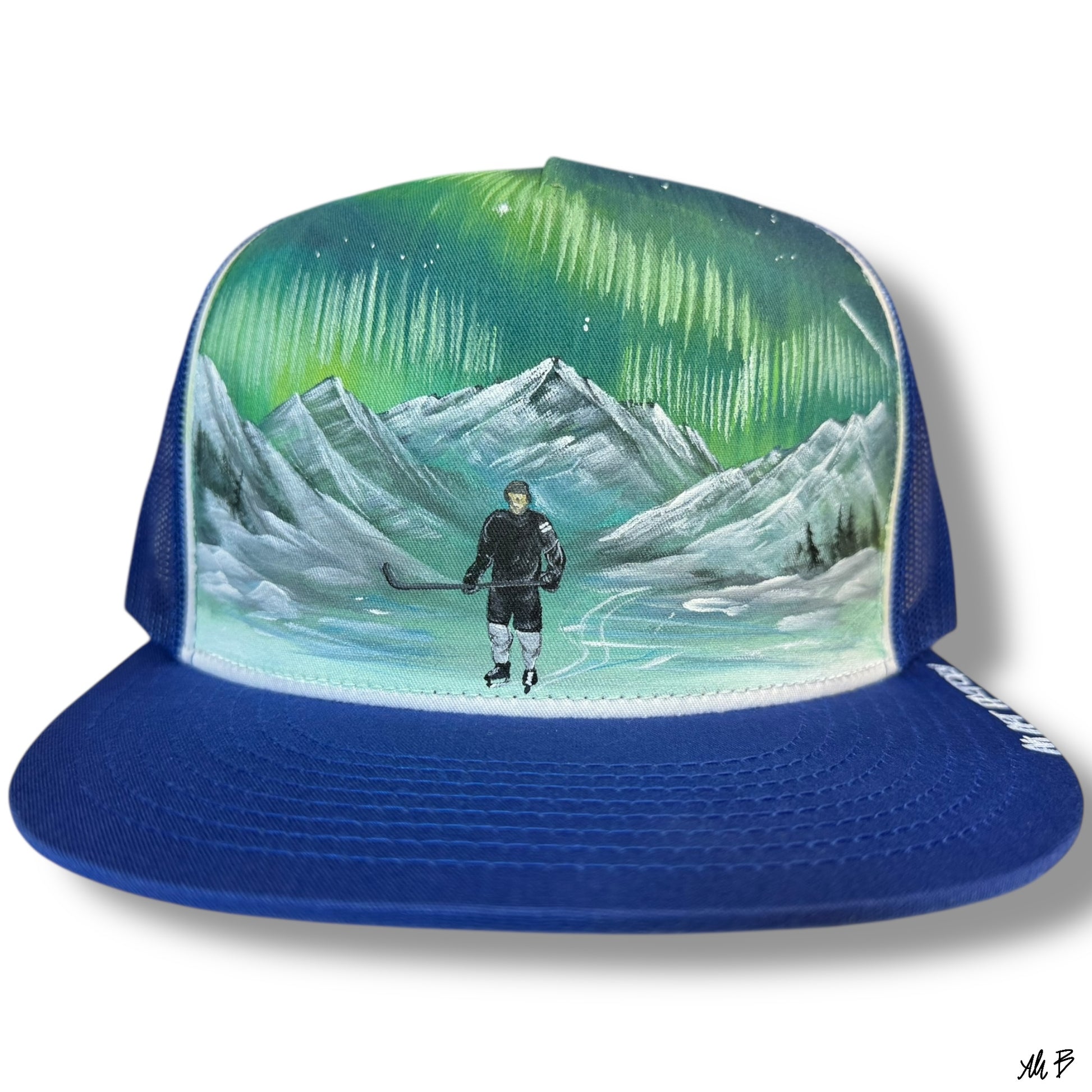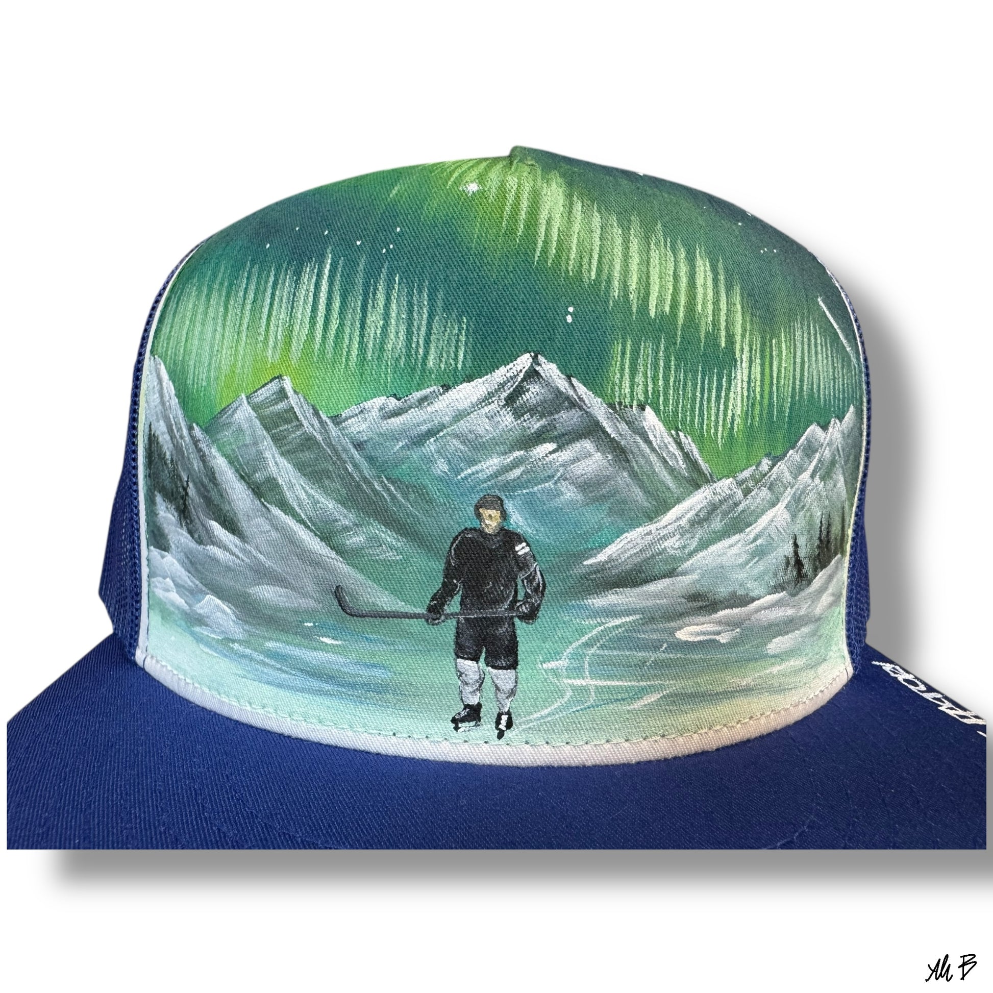 This hockey player has no regrets as they skate under the northern lights while snowy mountains boom upward in the background.