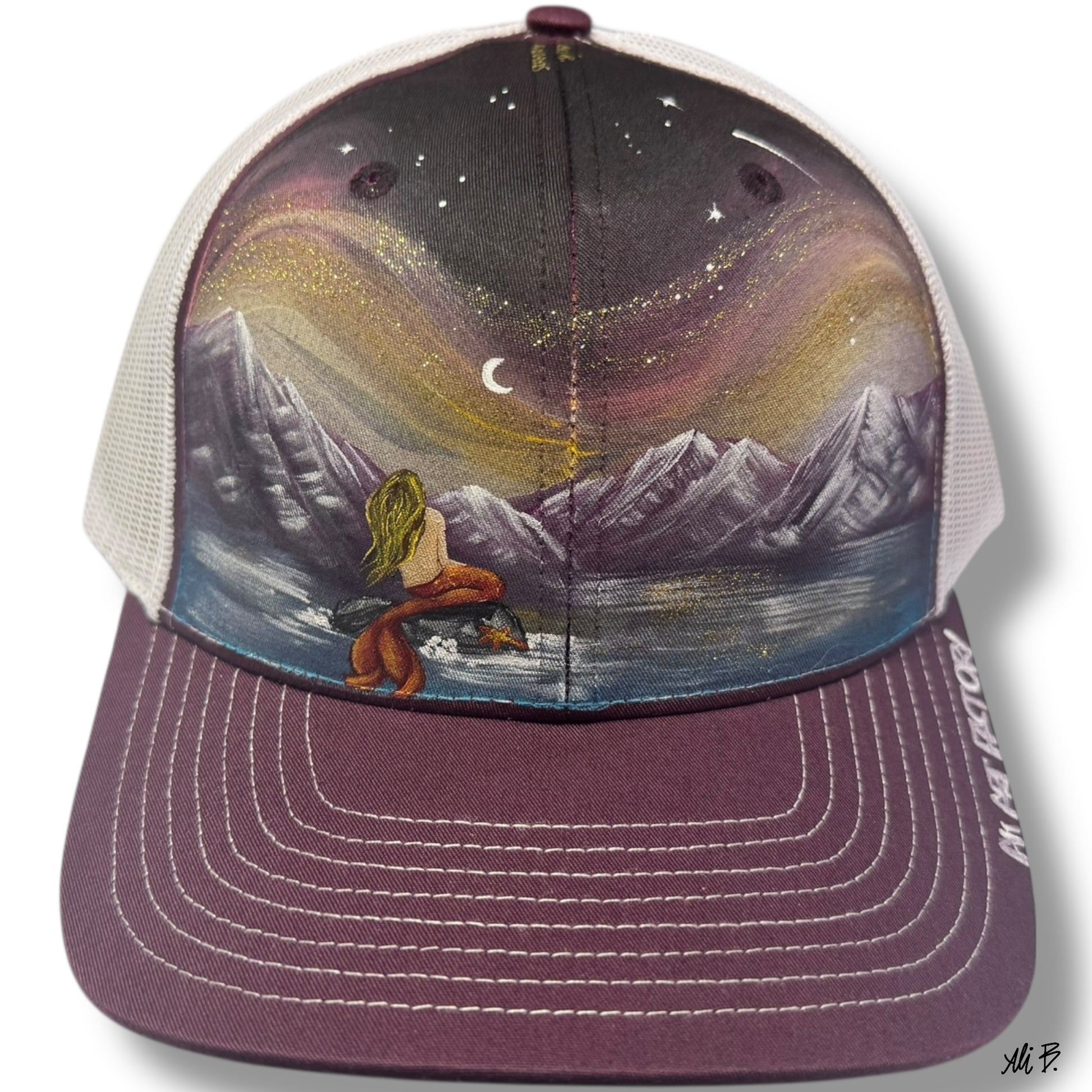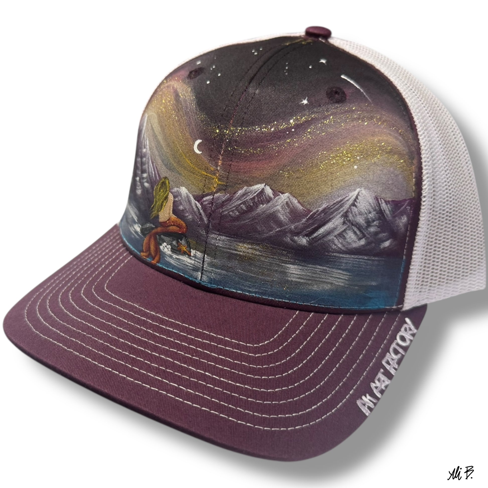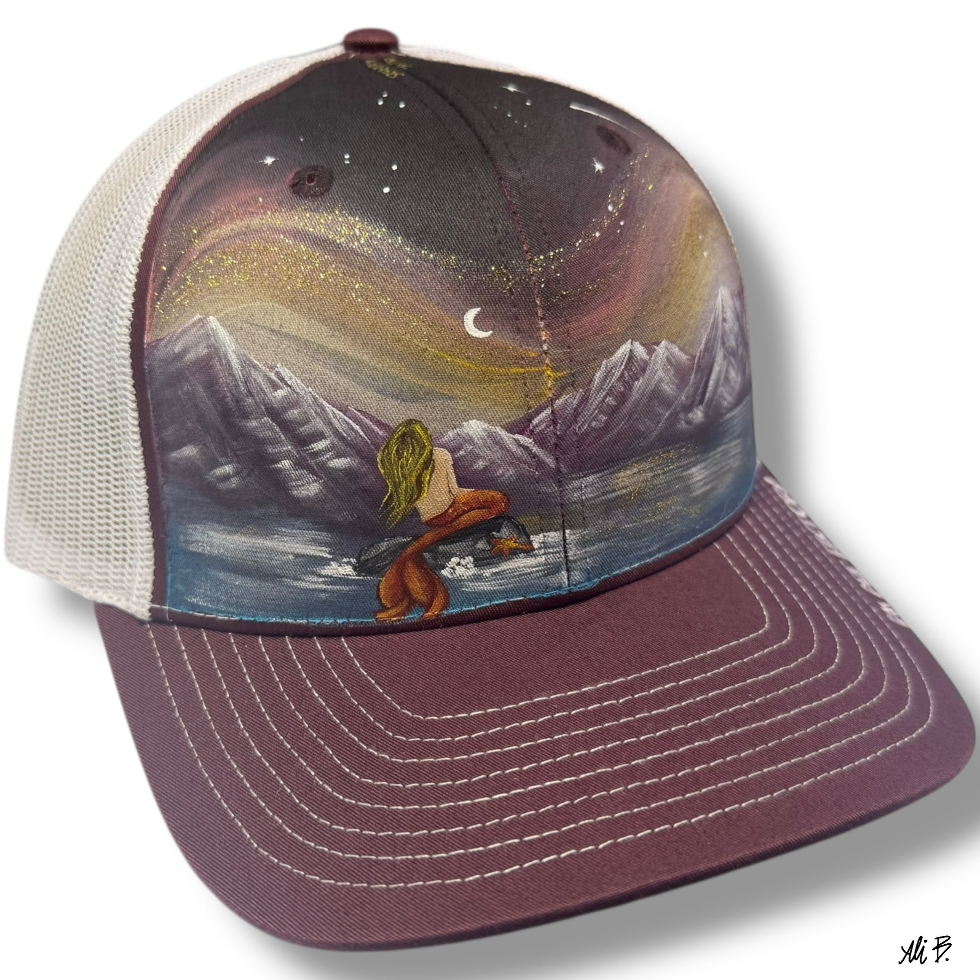 The majestic mermaid sits on a rock with her sea star friend, watching the glittery sky dance above her.