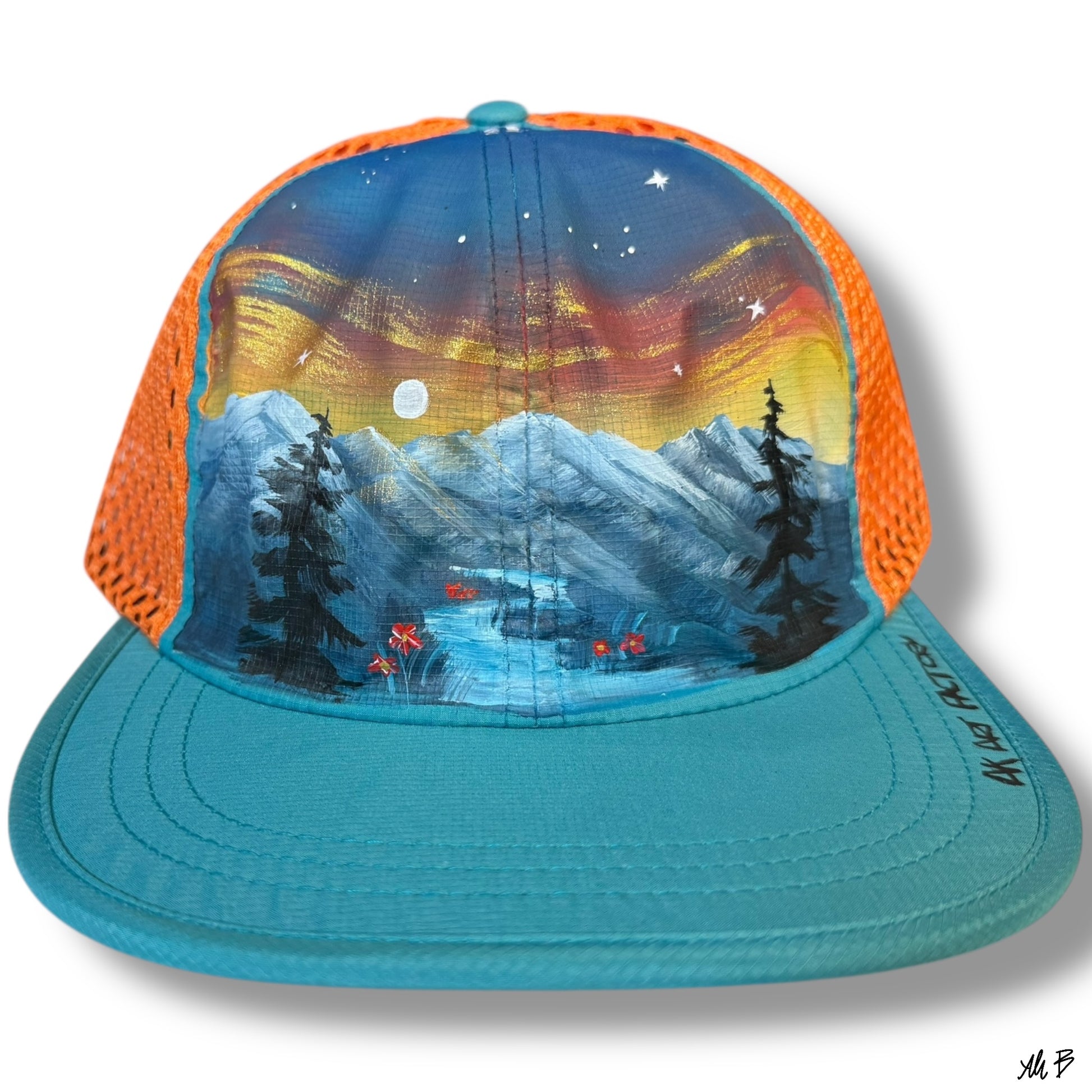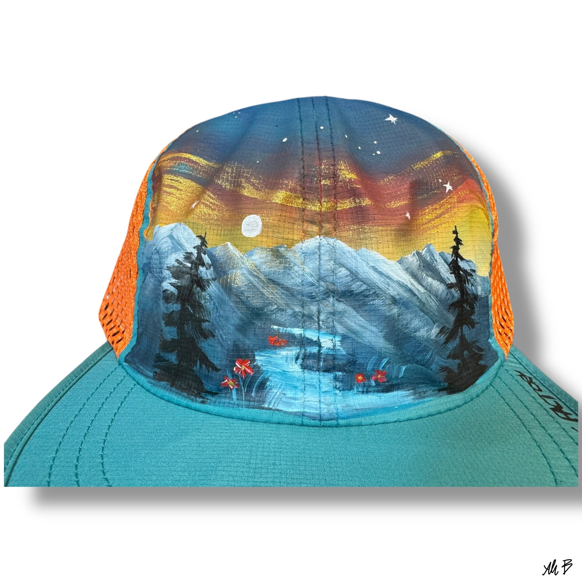 The sky swirls with dashes of metallic gold paint above the blue tinted mountains, a flowing river, and a few forget me nots to seal the deal on this beautiful evening.
