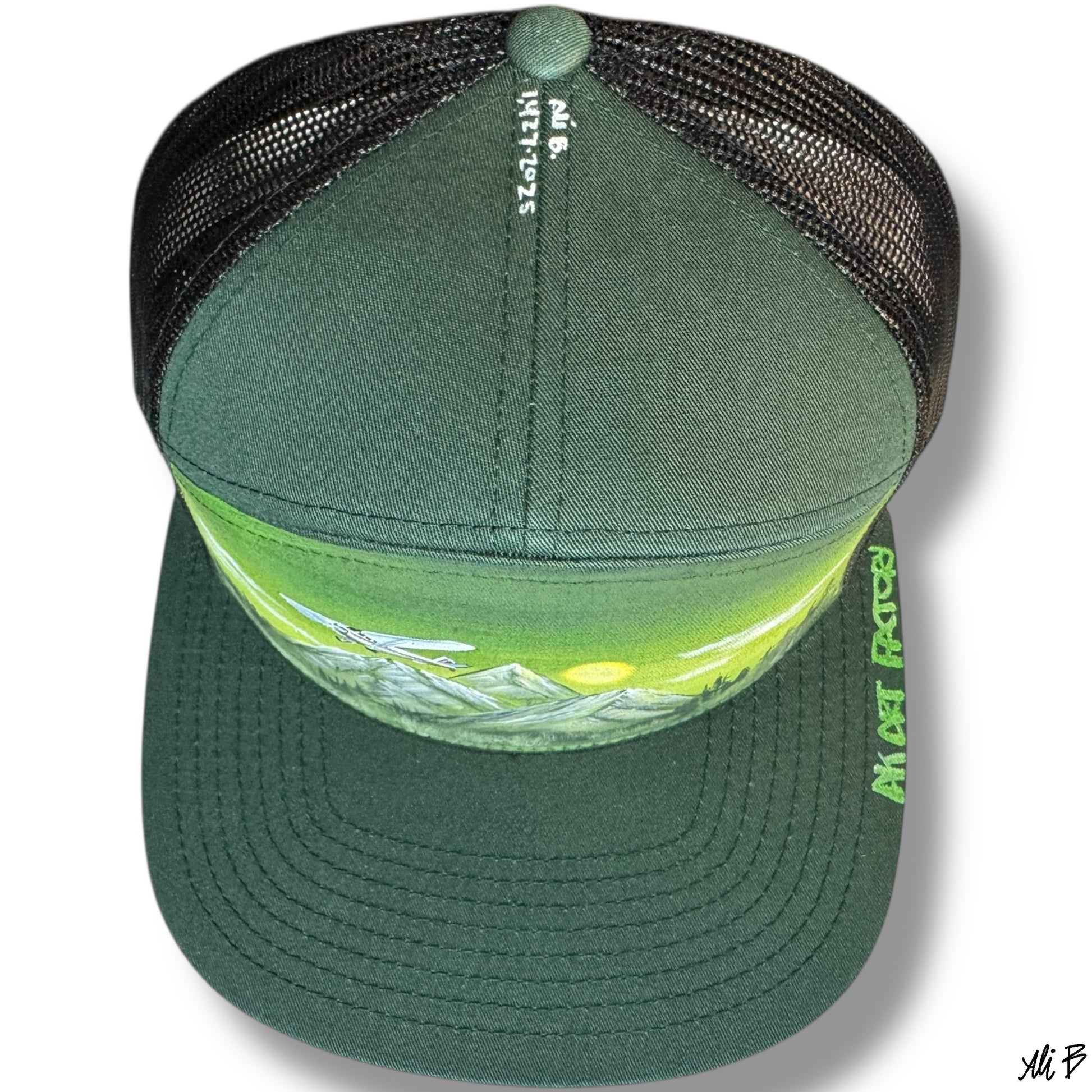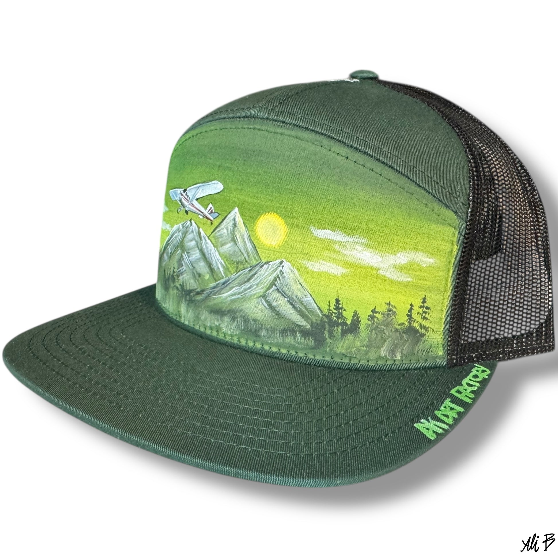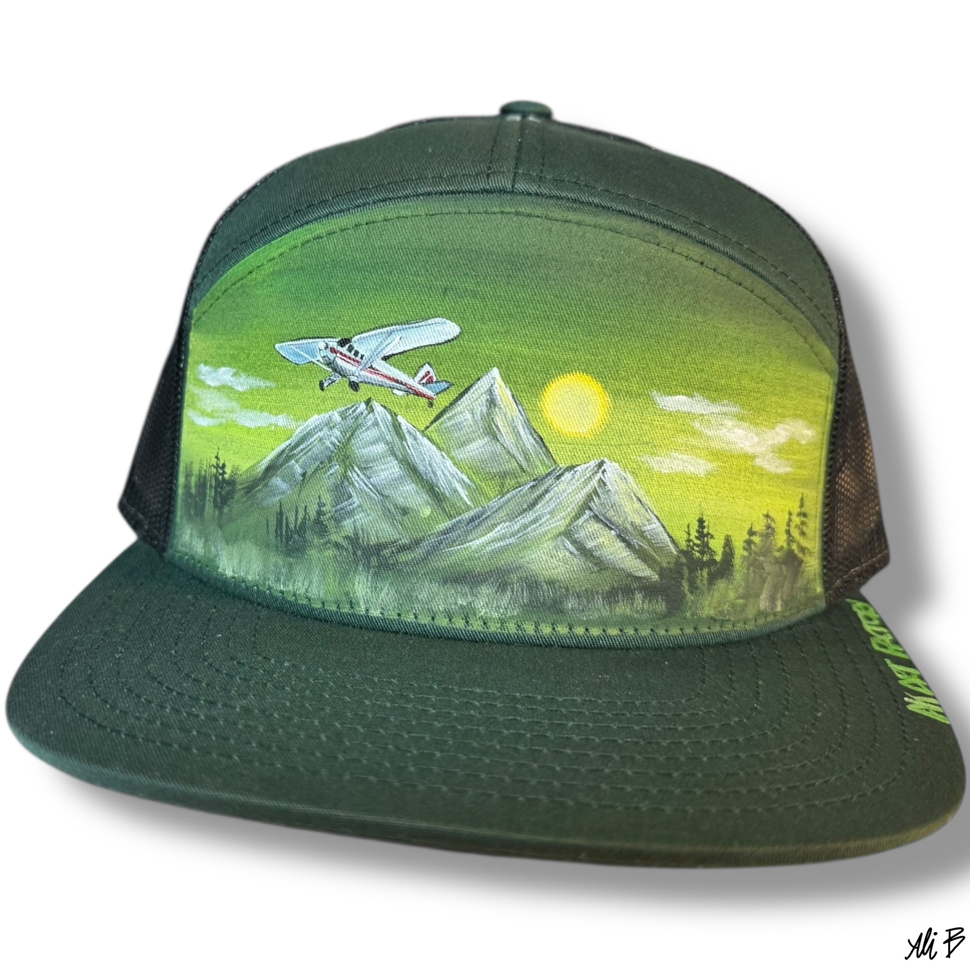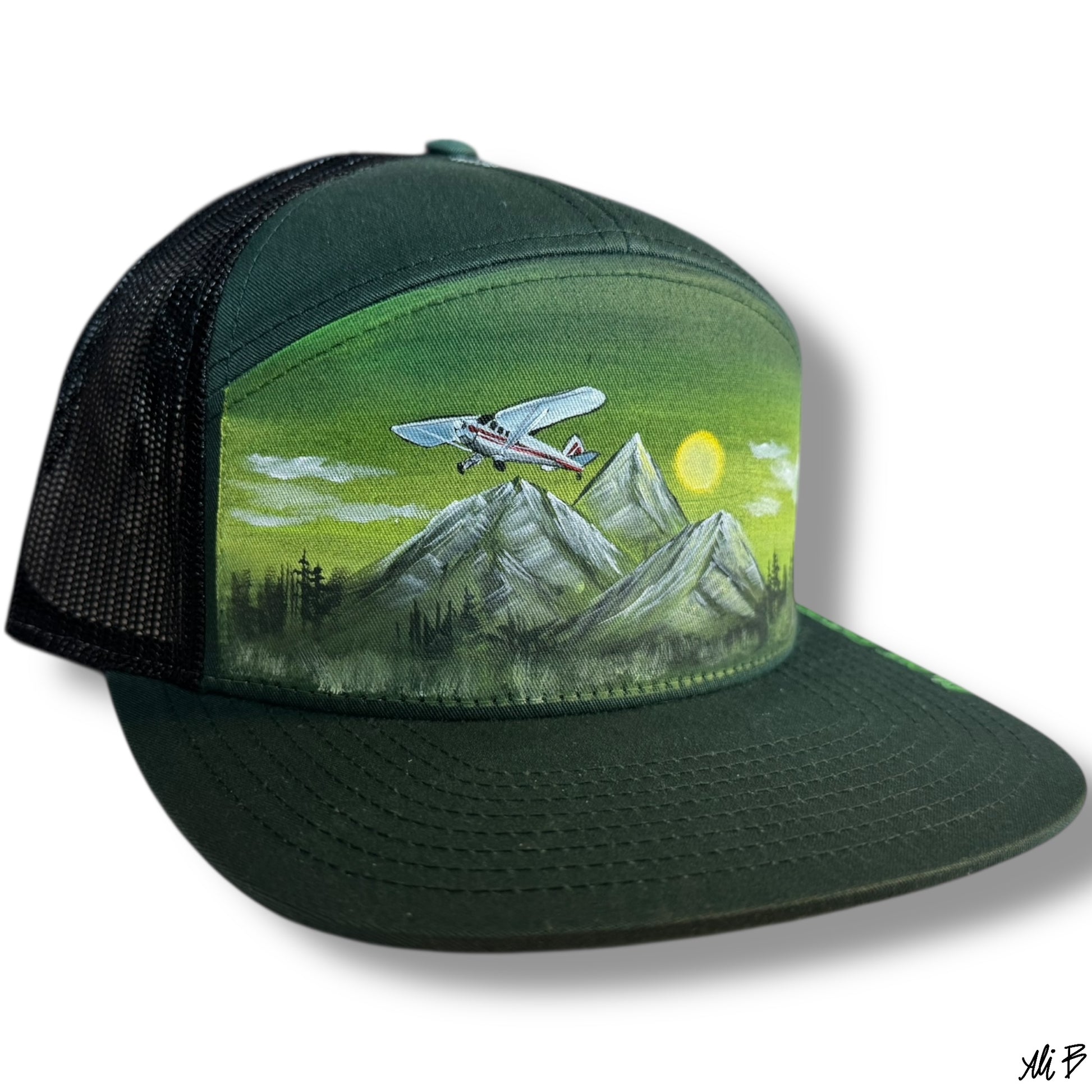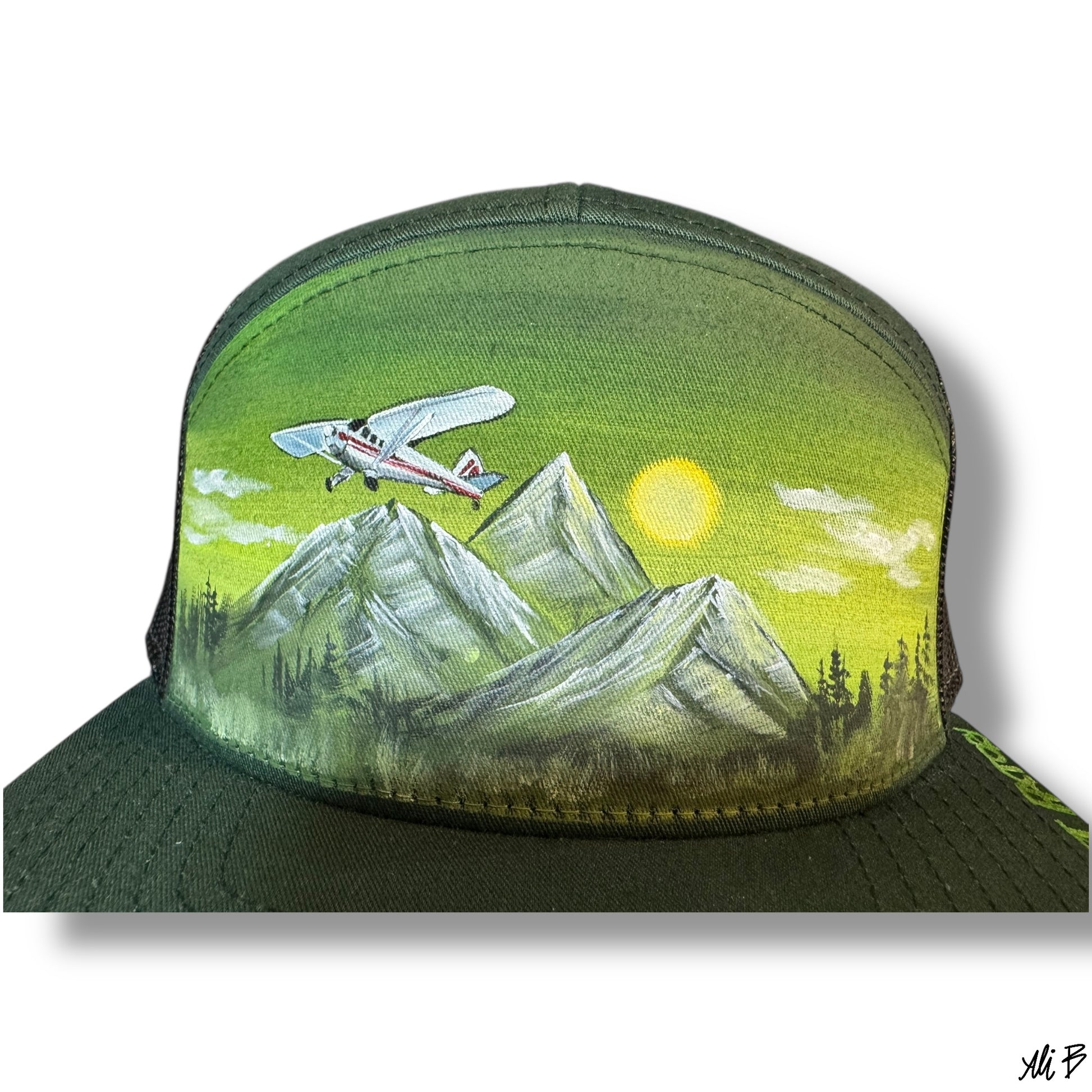 This hand painted hat features a Super Cub flying away, with green, snowy mountains and the sunshine to light the way.