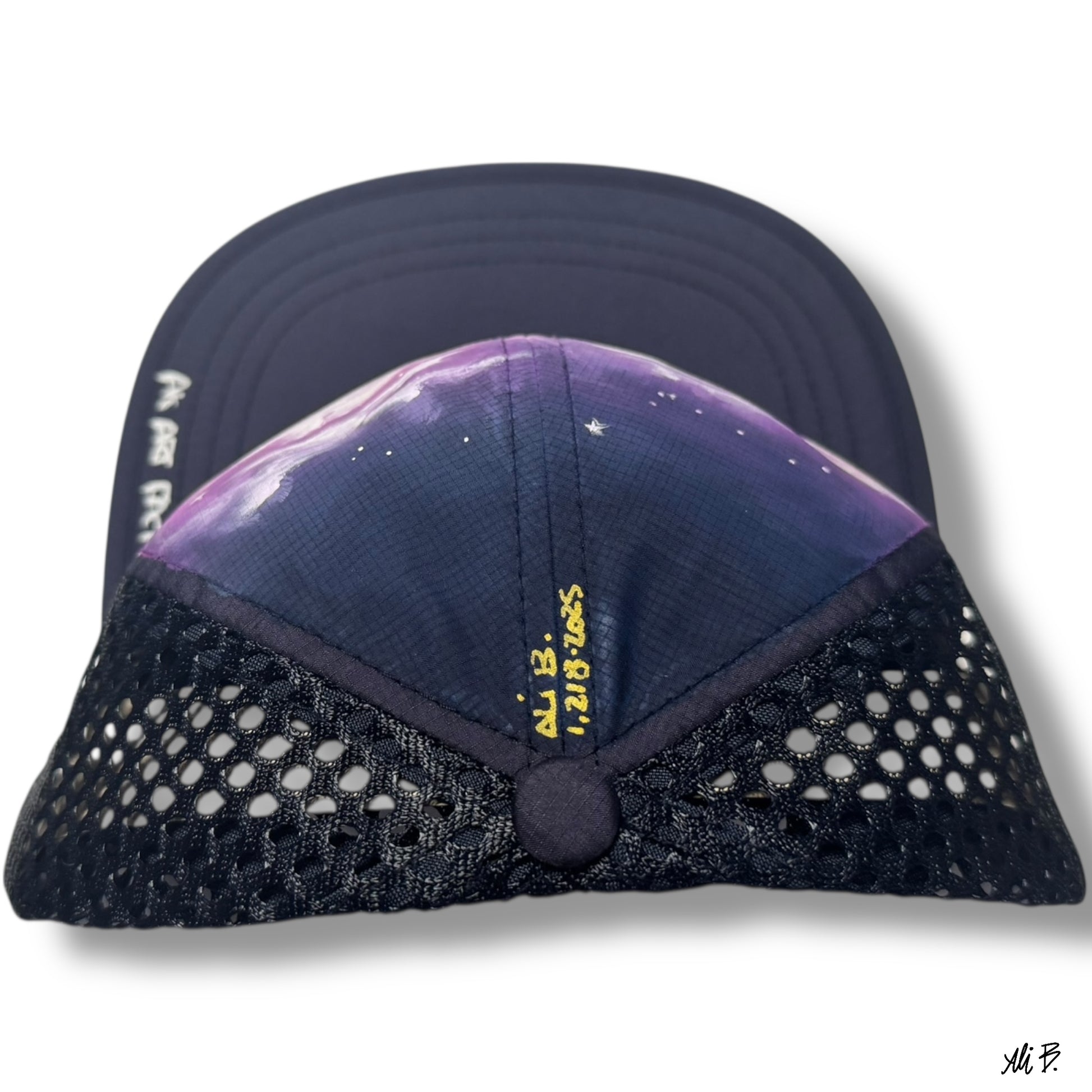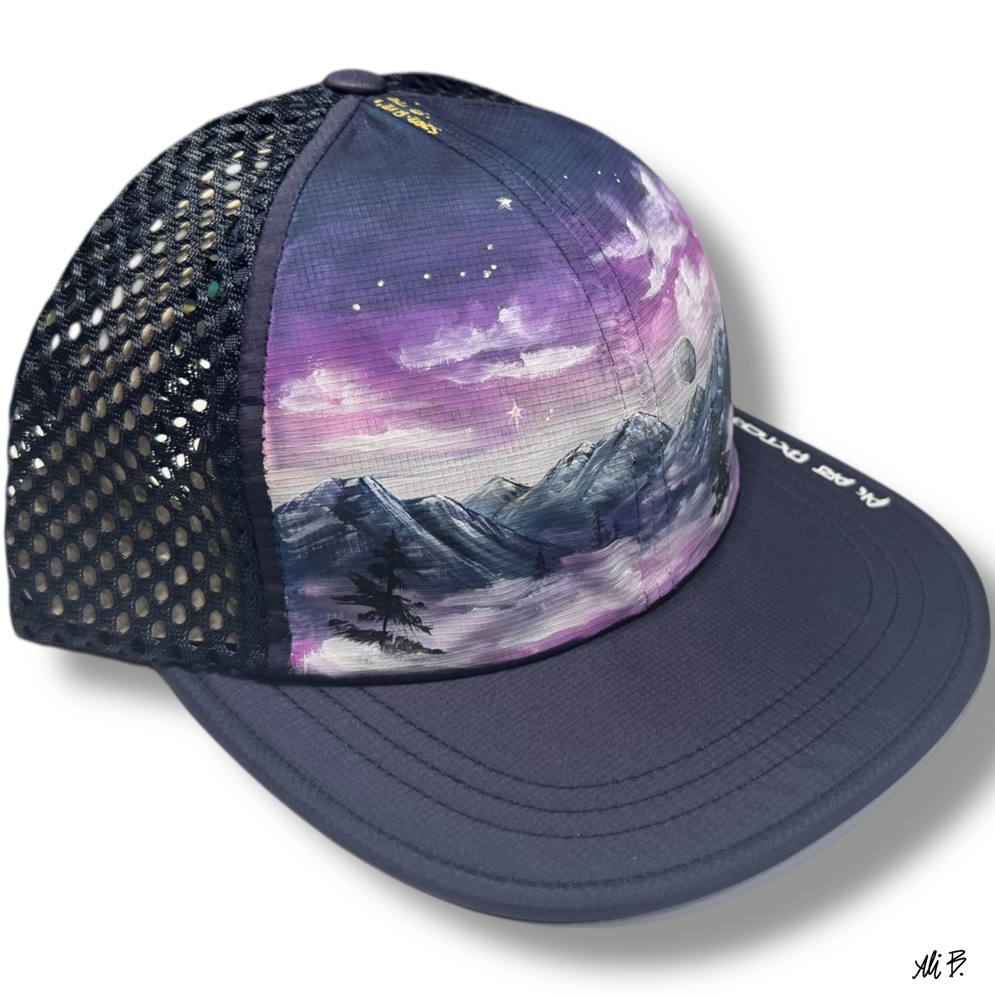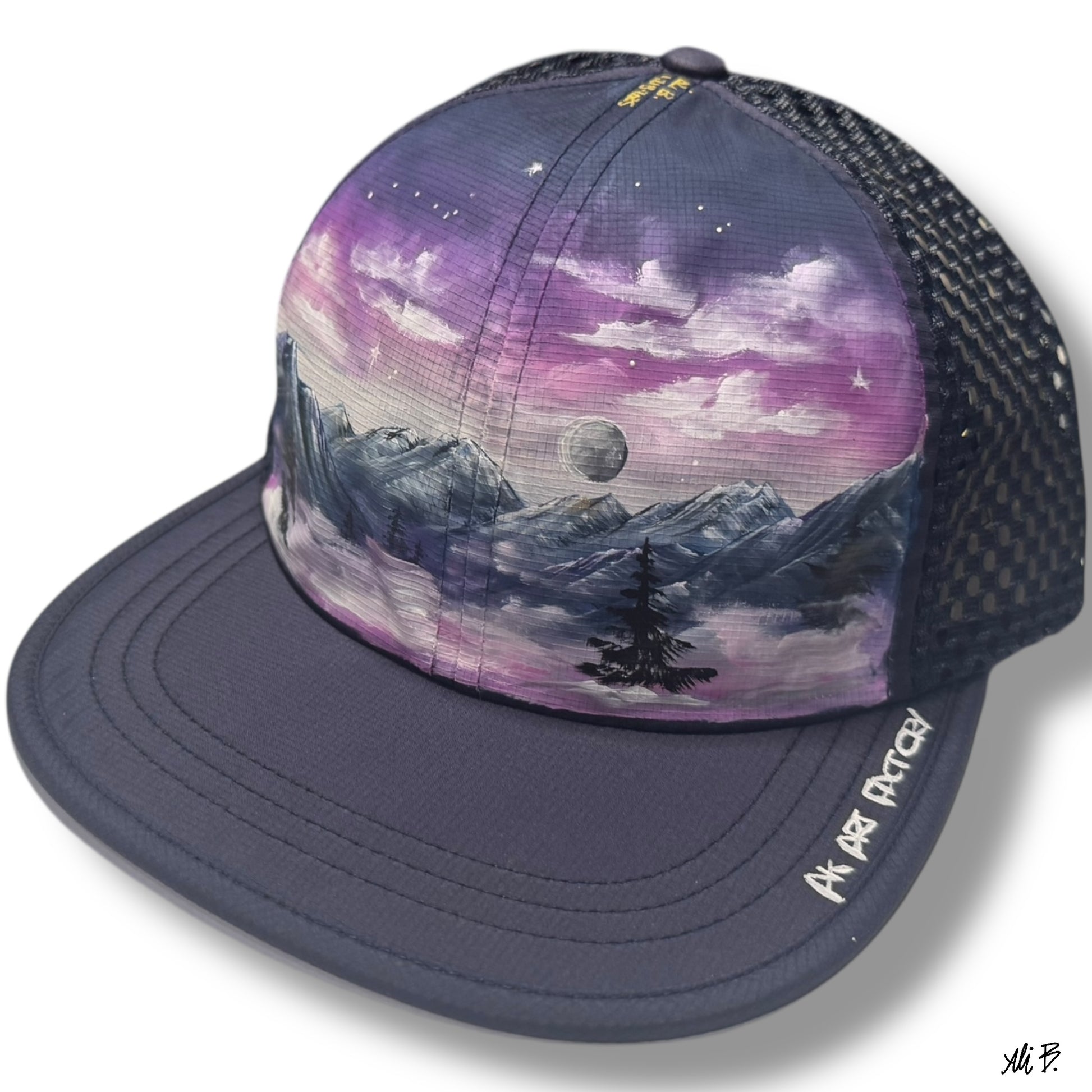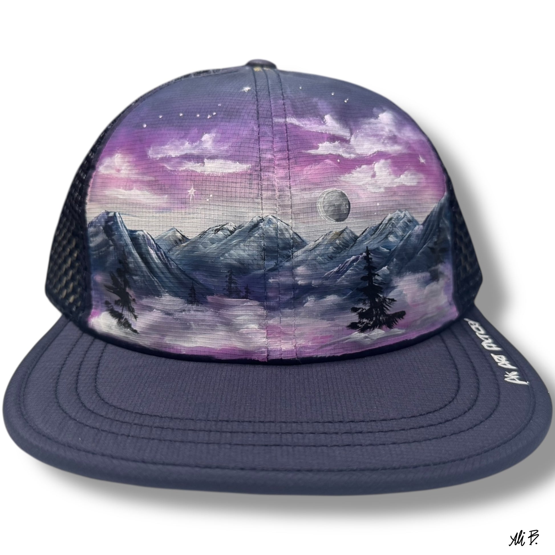 The ski is lit up by a purple hue, making the fog below look almost blue, stars twinkle in the sky as the moon rises way up high. This hat is so delicious looking, it feels like what cotton candy would like like if it were a nature scene.