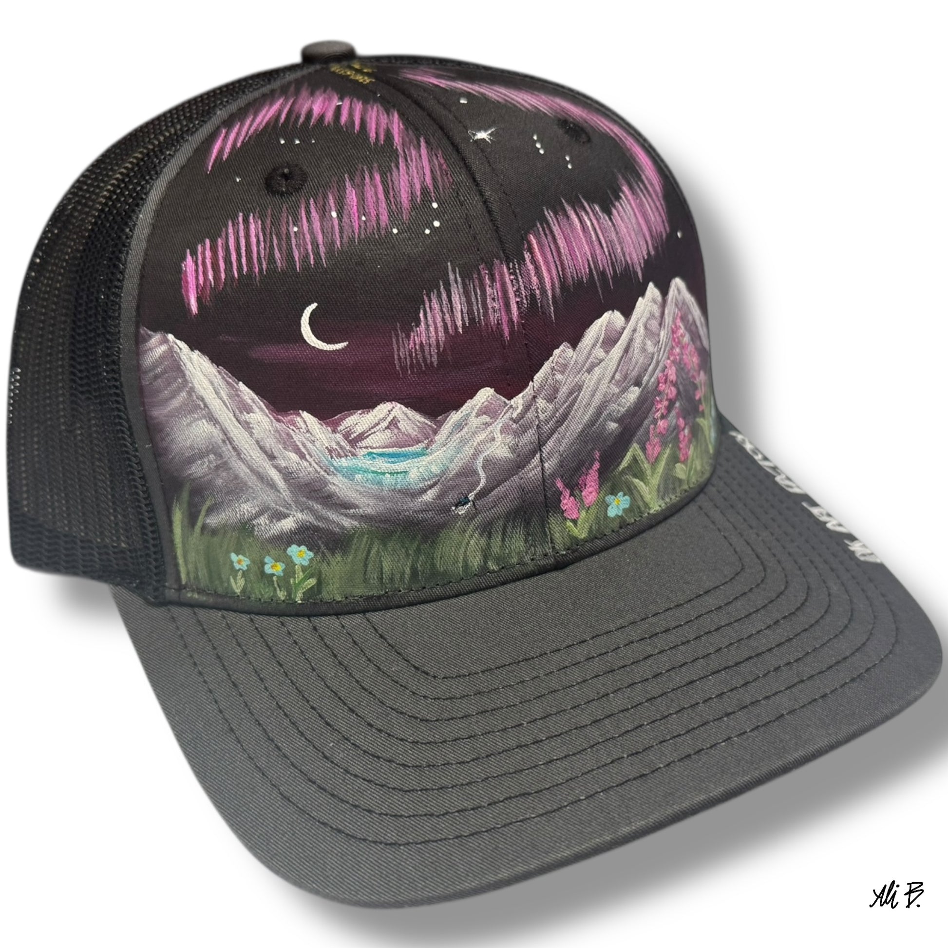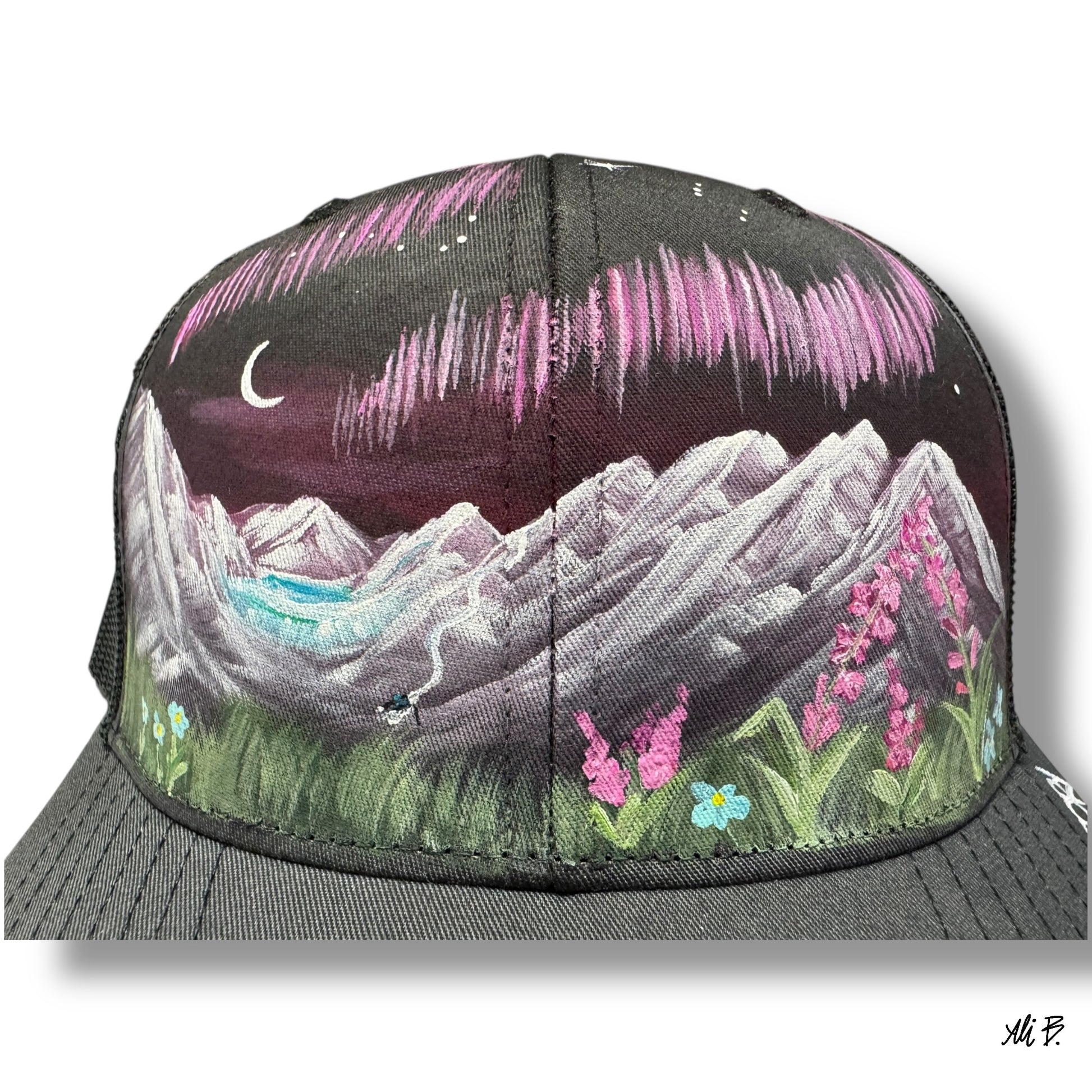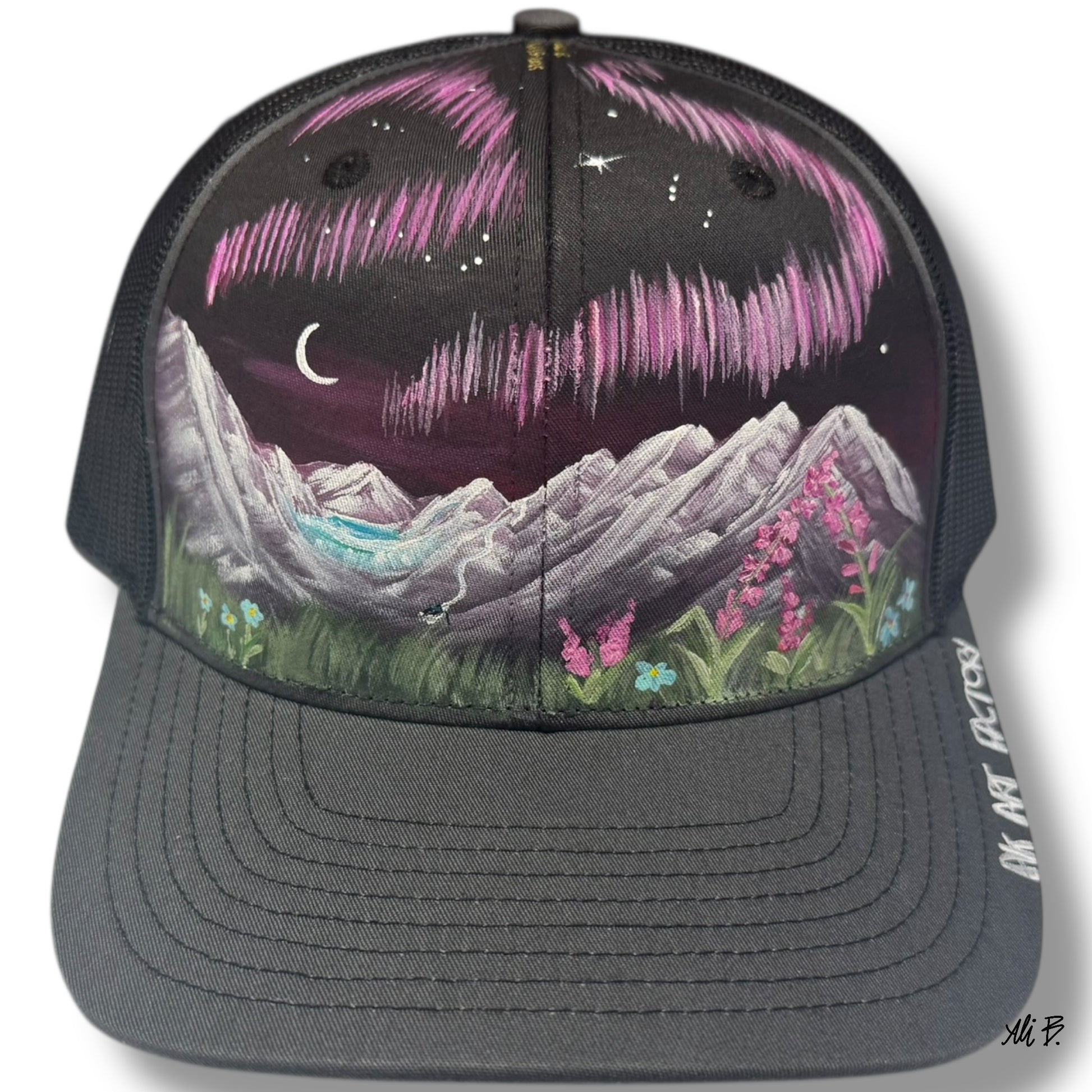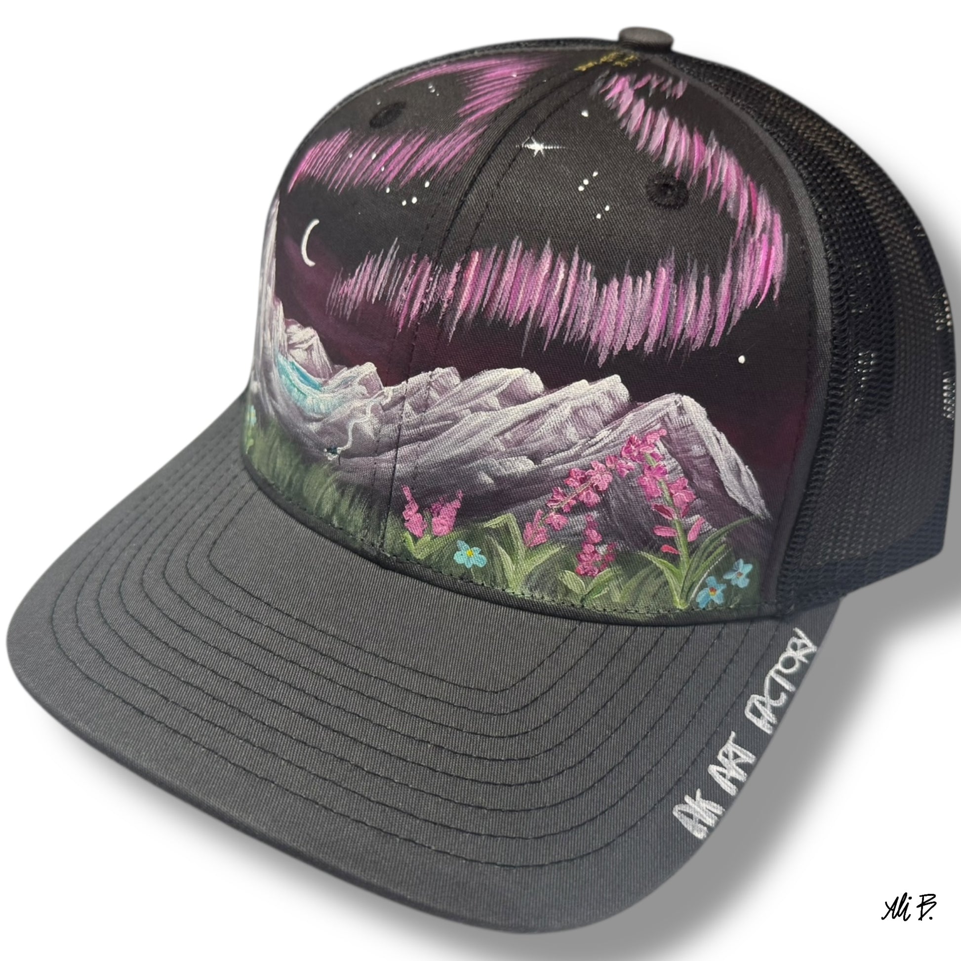 It may be a little early to be skiing, with the fireweed still out, but this skiier wastes no time! Northern lights dance in the sky and a glacier sits in the mountains in the background.